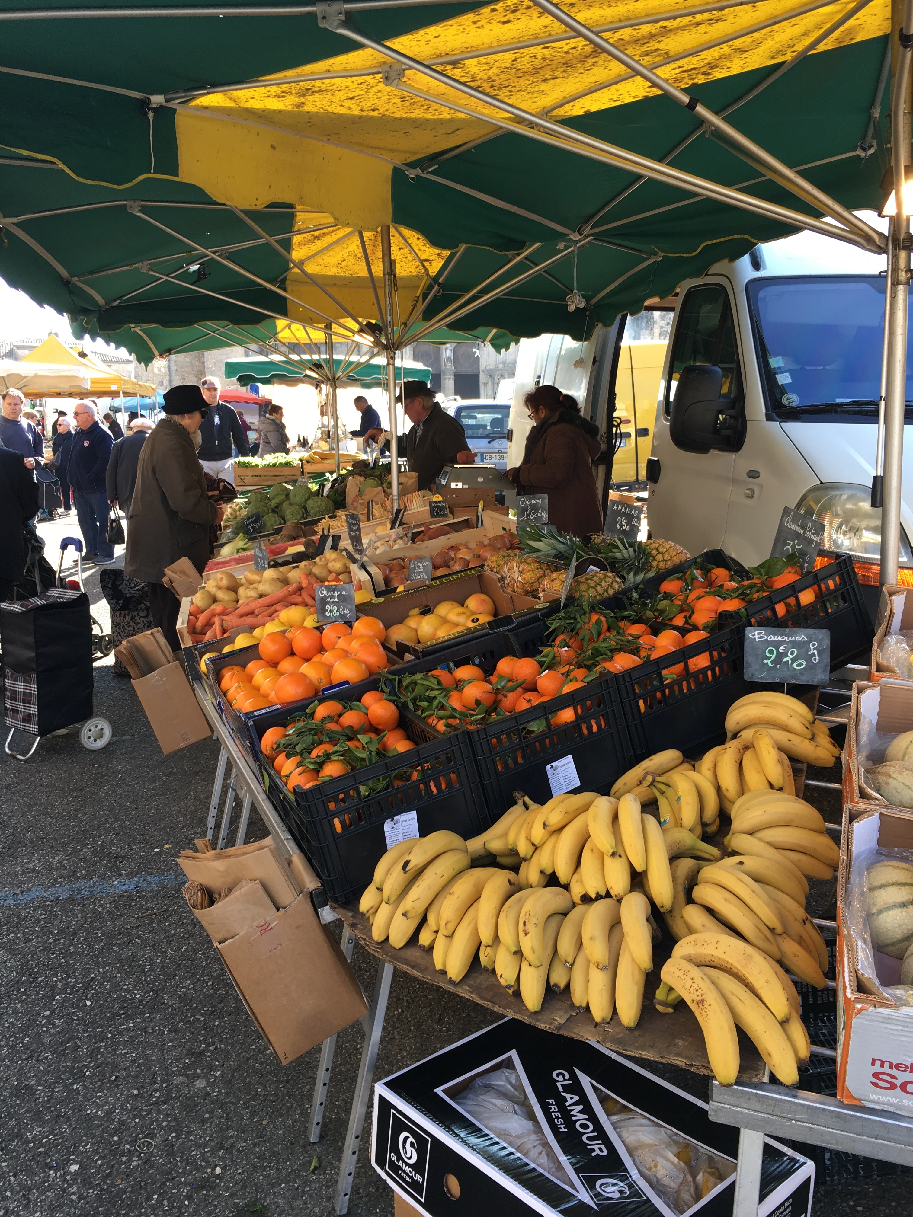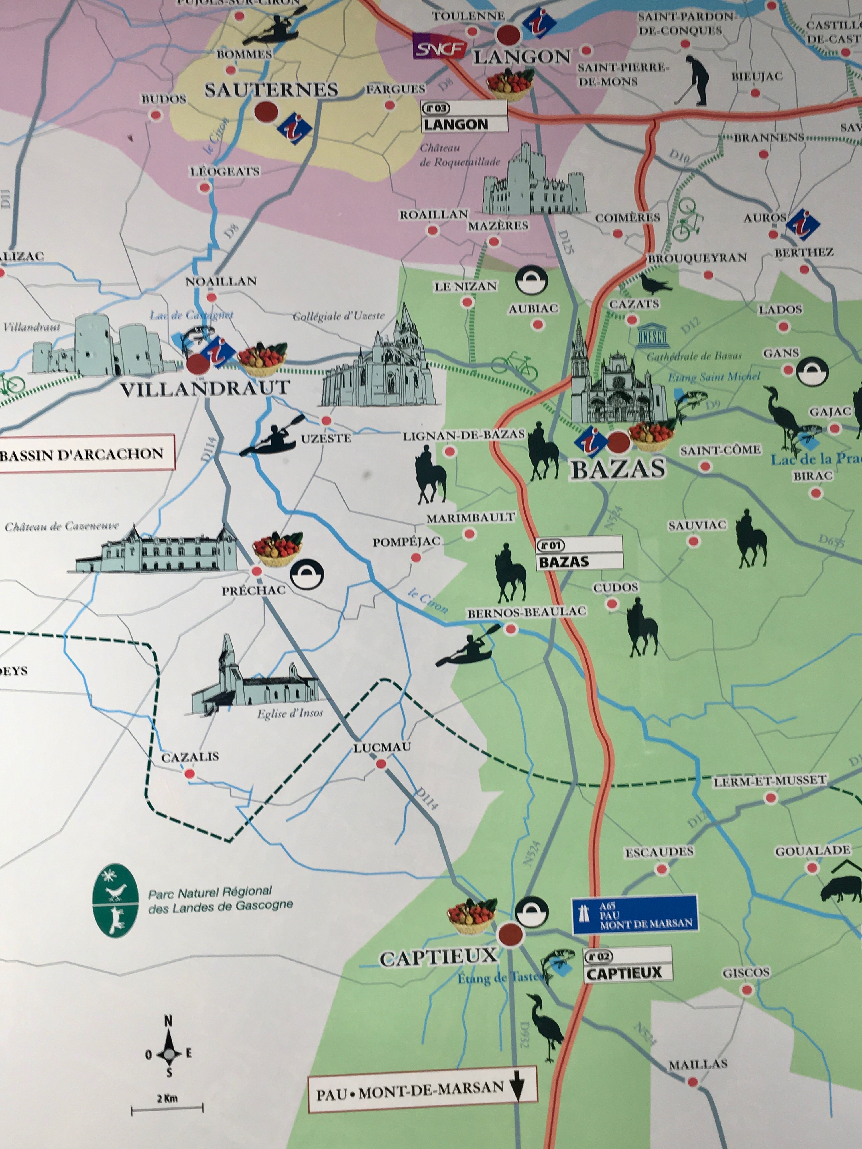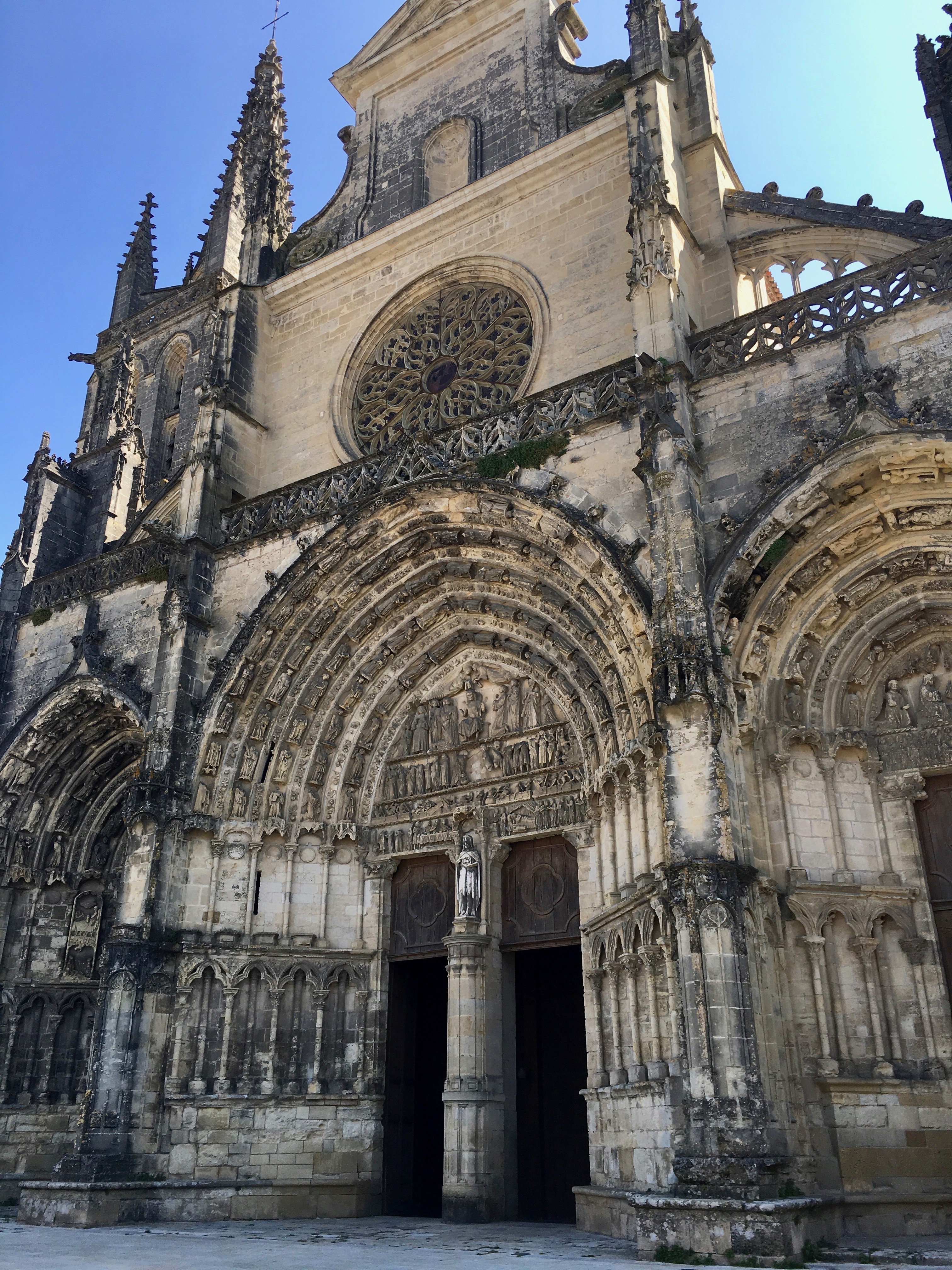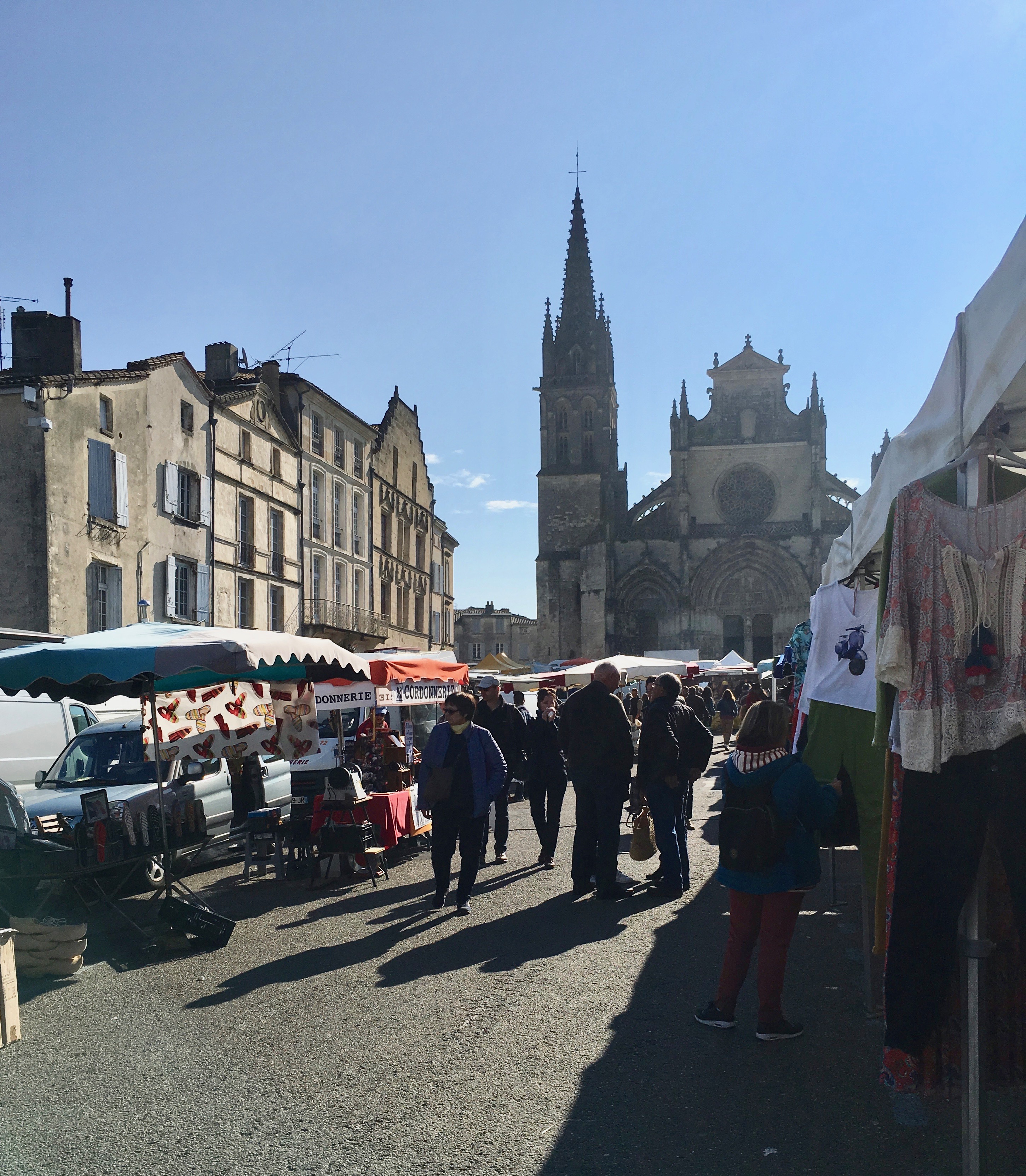 On Saturday, April 13 we went to Bazas for the market (you can never go to too many markets!) and to have lunch. Bazas is a town about 20 minutes from Auros where we are staying. The map below shows Bazas and the surrounding area including Langon where we were yesterday. It is known for its famous beef and for the Cathedrale Saint-Jean-Baptiste. The cathedrale dates from the 13th to 14th centuries. It is one of the cathedrales on the Routes of Santiago de Compostela. This route has been followed by pilgrims since the middle ages. It was a route from France into Spain.