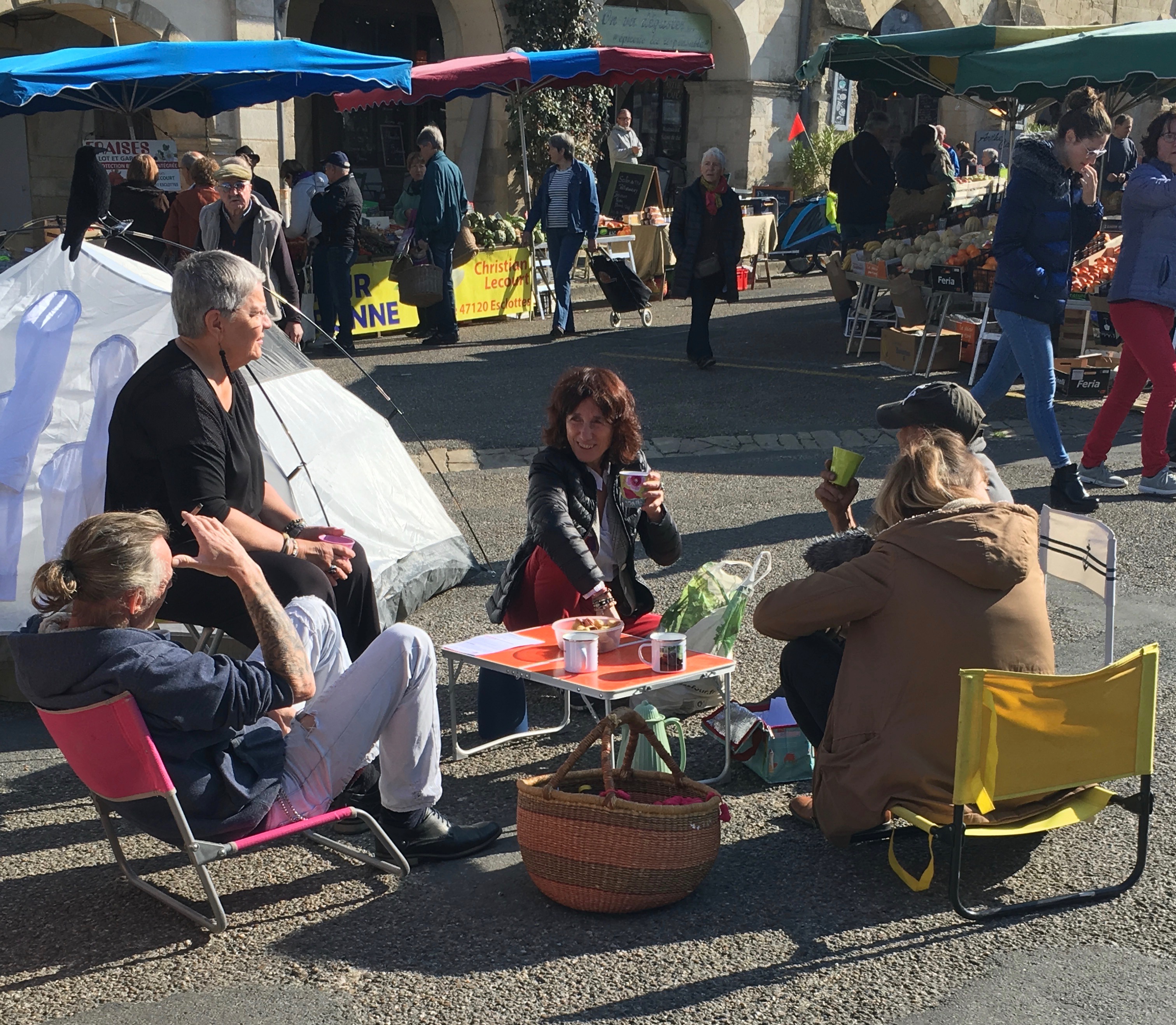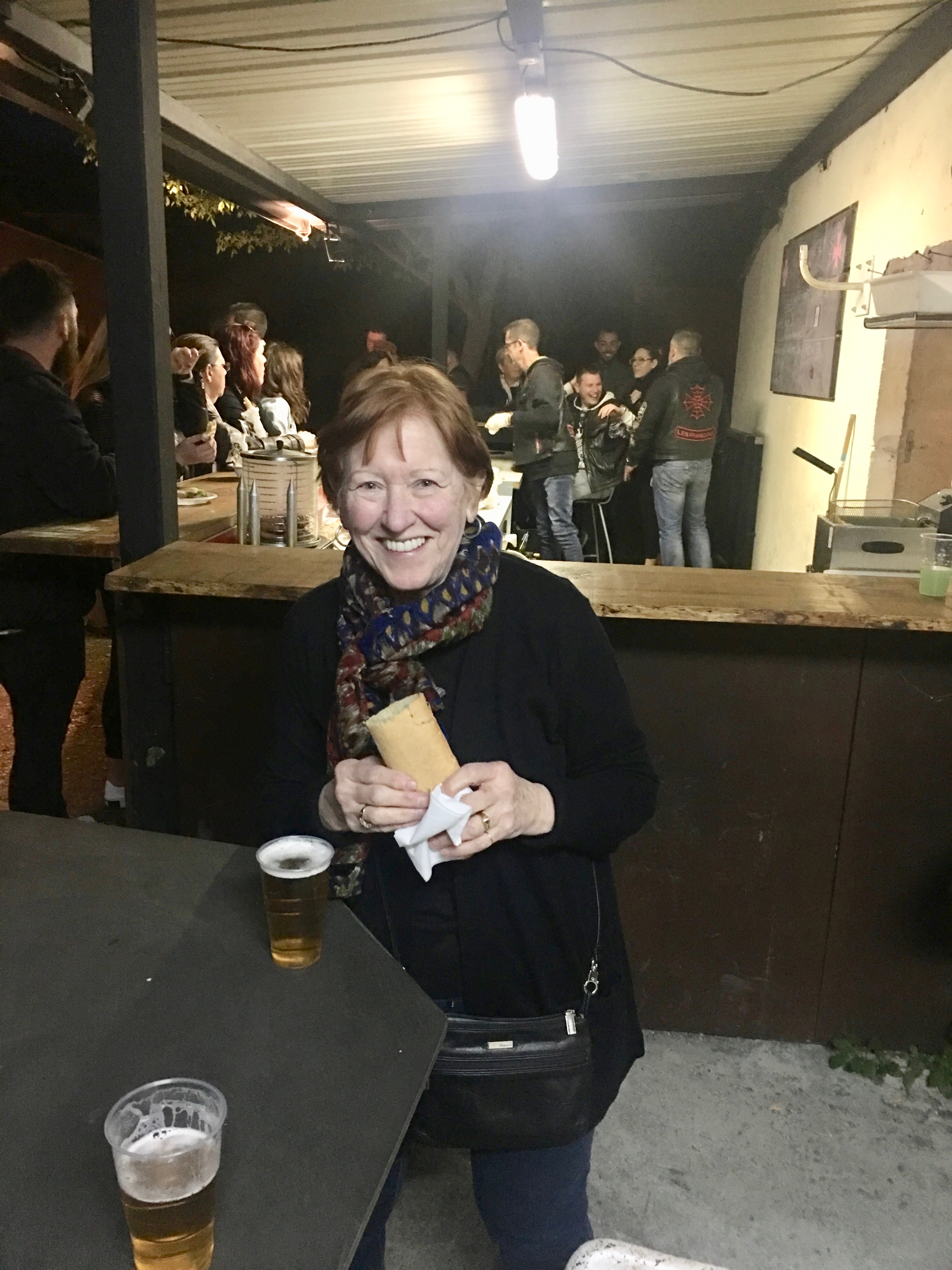 We got a text from Megan saying a band was playing at the local bar, Le Coyote. We had walked by it several times on our way to the market and it looked a little rough. They were suppose to start at 8:30 so we wandered over about 9. Well, it was an interesting experience. It was a biker bar. Most all of the patrons were in their leathers and had a spider web on the back with the words “Les Frangins” (The Brothers). The band instruments were set up but no band in sight and there was no seating inside. We went out back after getting some beers. This was the smoking section and eating area. They were cooking up something and people were crowded around. I wanted to take pictures inside the bar but I didn’t think it was a good idea.