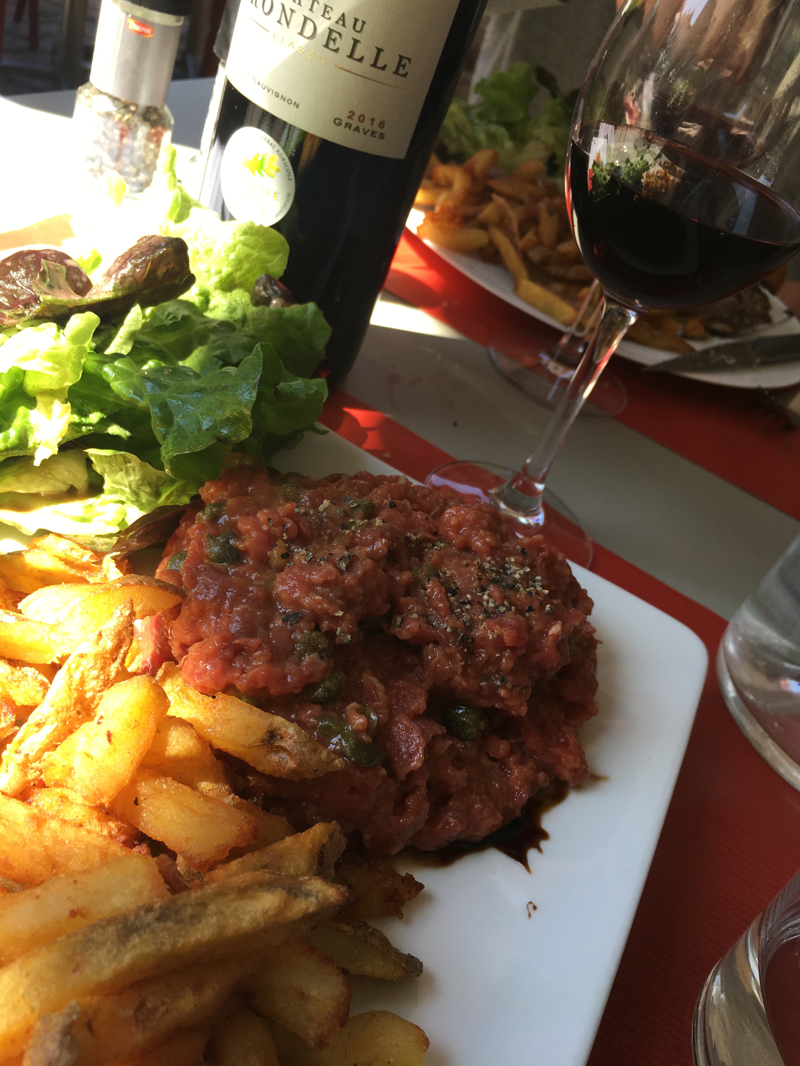 After the market we drove back to put away our fish and cheese then came back to Bazas to walk around until lunch. We were eating at Le Boeuf Pop and thankfully Megan made a reservation for us because the place was packed. The owner is from the US but has been in Bazas for many years. He is originally from Georgia and no, he does not speak French with a southern accent! His daughter waited on us and was very happy to speak English. She only speaks French at home. They are noted for their beef so of course we had some. Scott had a cheese burger (he said it was great) and I had beef tartare. Our grandson Jacob would have been very happy to try some. Jacob, it was delicious. We sat there for 2 1/2 hours. Very enjoyable. Back to Auros to nap and then we enjoyed a drink by the pool.