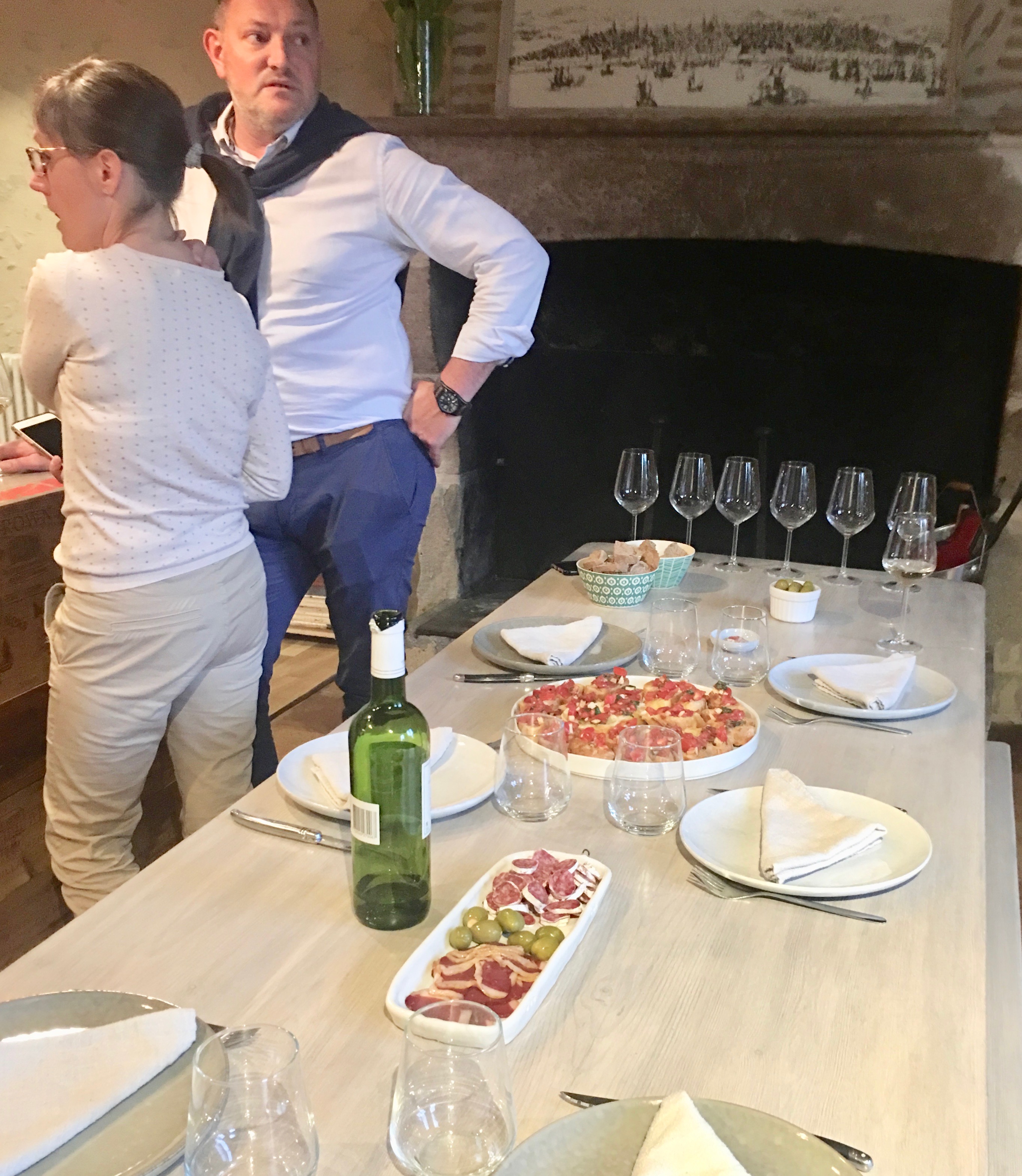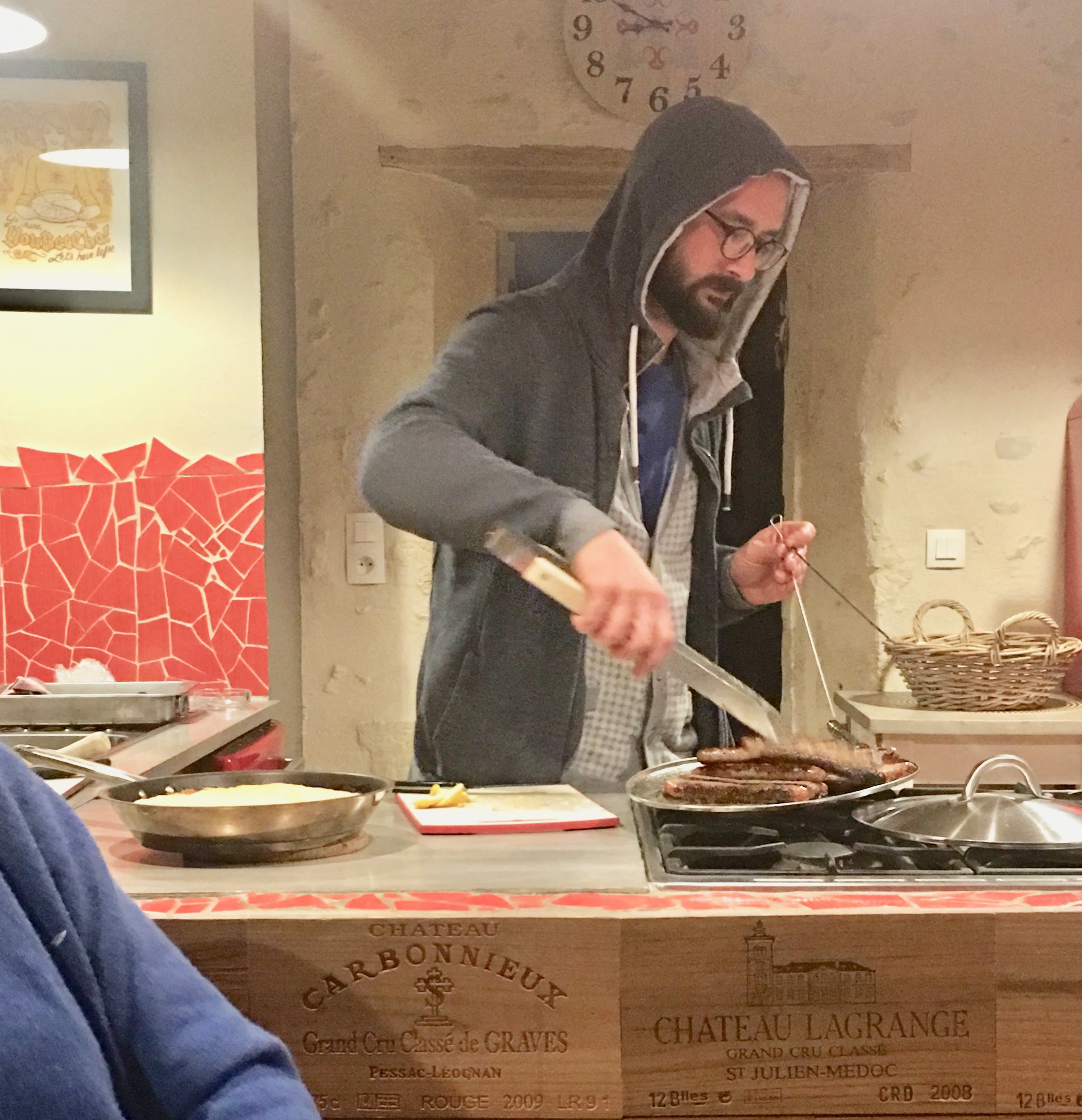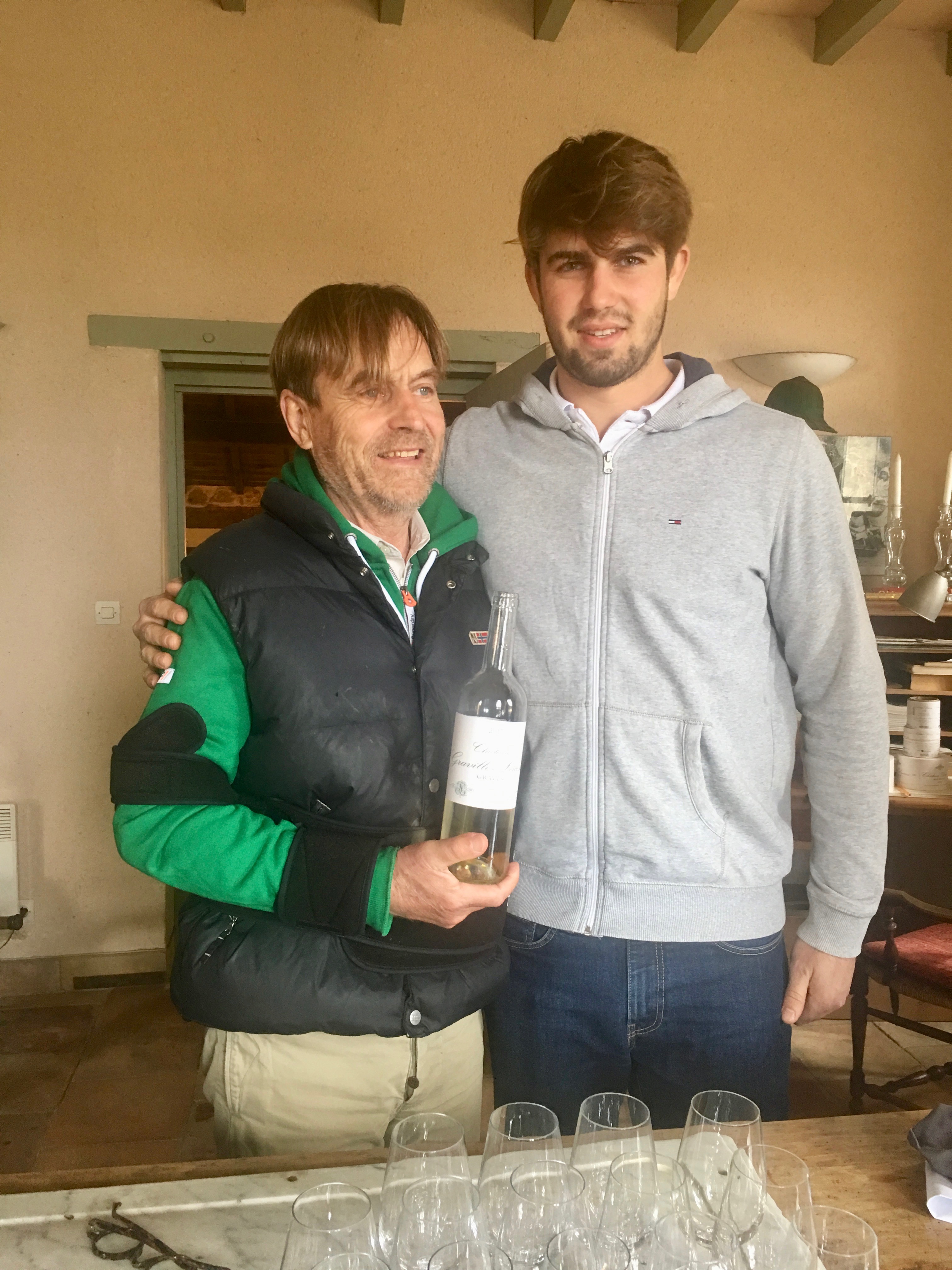 We headed back because we had a Sauternes tasting scheduled for later in the afternoon. Neither Scott nor I particularly like sweet wines but we decided to try them and we were very happy we did. Julien and Megan’s friends Francois and his wife Amelie were staying for dinner and also going to the tasting. The owner of the vineyard, Herve Duberdieu, met us along with his oldest son Andre. Herve talked about how his family has been growing Sauternes grapes for six generations. He told us that Sauternes is made from Sauvignon blanc and Muscadelle grapes that have been affected by Botrytis cinerea (noble rot) which causes the grapes to become partially raisined concentrating the distinctive flavor. We learned that he lived in Minnesota when he was younger and worked for Jack Farrell of Haskell’s in Minneapolis. When he was working he met Kermit Lynch a wine importer. His wines are imported all over the US through Kermit Lynch and we have seen this on many wine labels which we have purchased.