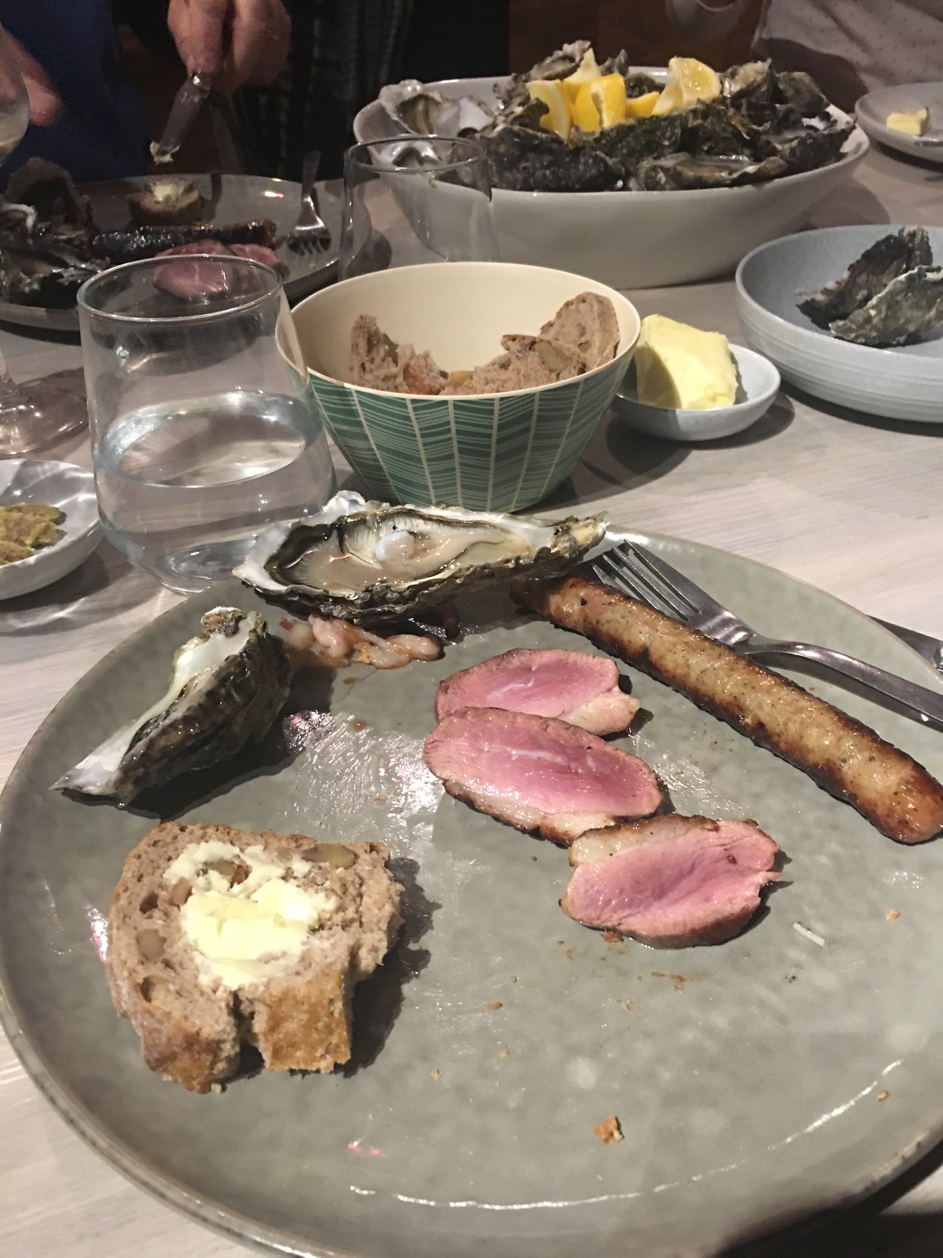 We went back and enjoyed an amazing dinner. While we were gone, Megan prepared a wonderful fresh bruschetta and meats and olives. Julien and Francois shucked oysters from Archeshone for our dinner. Julien made us duck (amazing) and an herb sausage. We learned you put butter on the bread and then put an oyster on it and enjoy! We had a tarte tatin which Julien made earlier in the day and then warmed, put sauce on and it was served with ice cream. Yum!