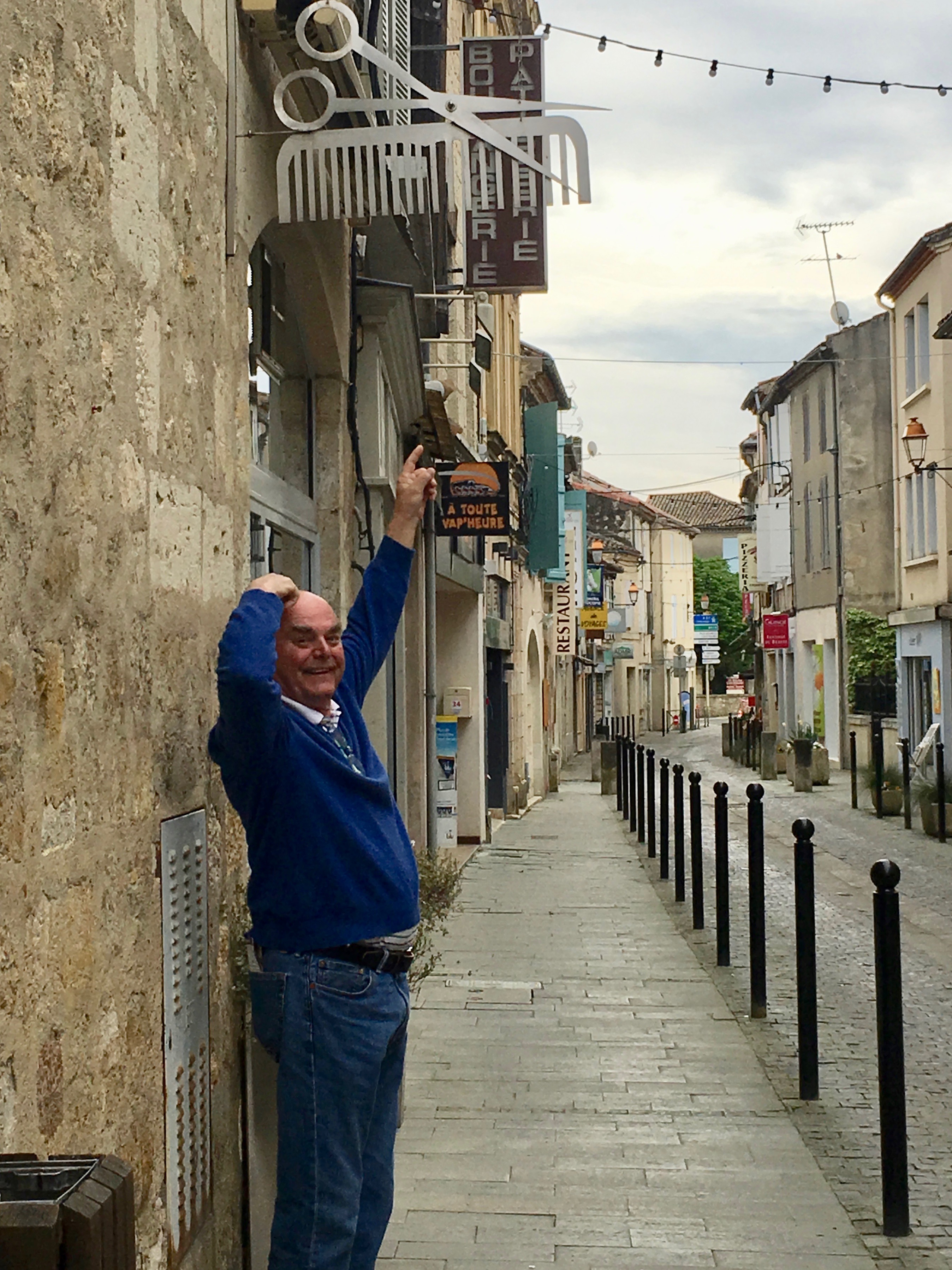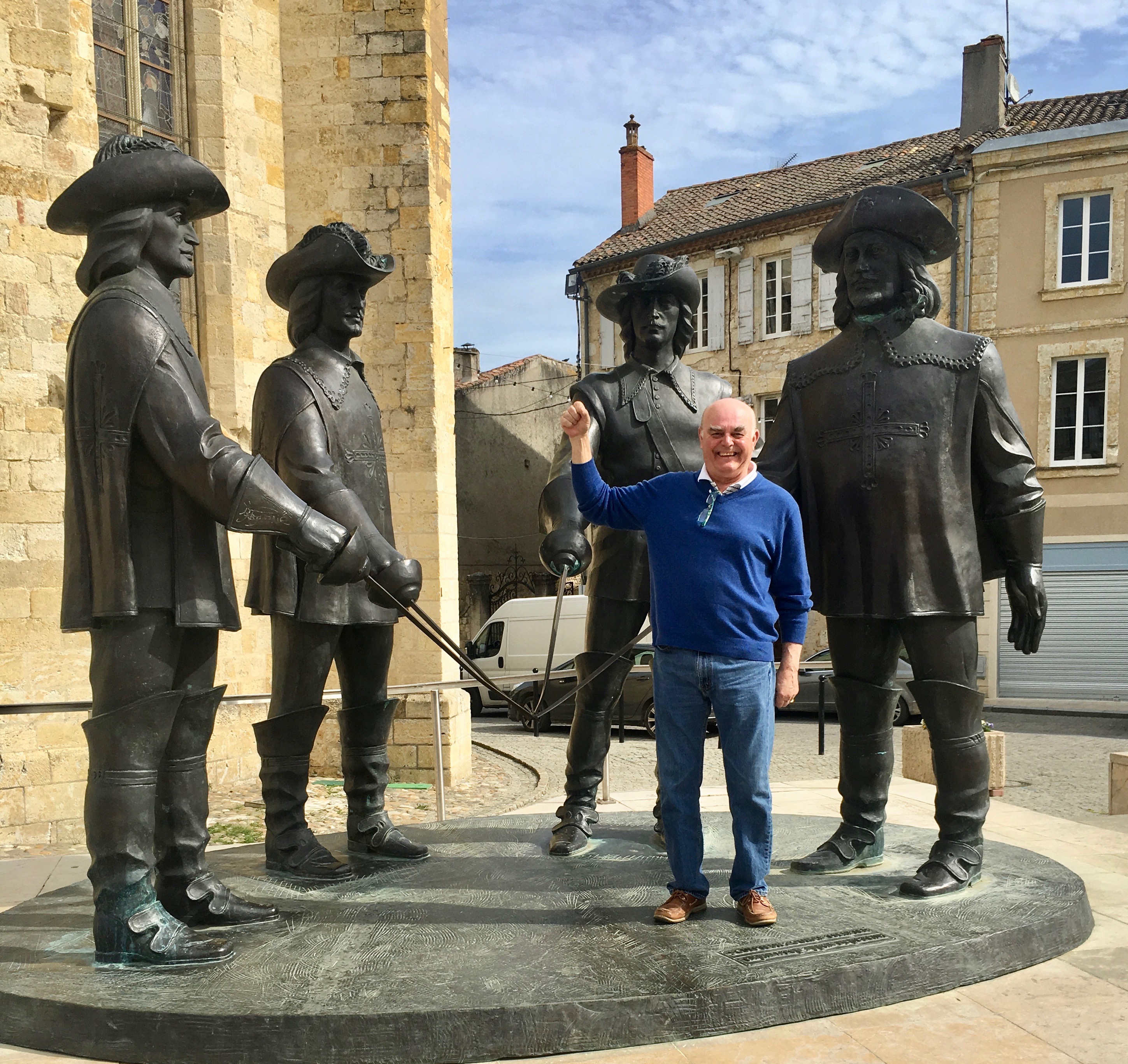 Today Scott and I decided to visit a few of the small villages. We picked Condom. (Pronounced Condone) For those of you who are laughing that of course we selected this village. Well we went there to see statues of the Four Musketeers. Yes, there are four: Porthos, D’Artagnan, Aramis and Athos. They reason they are celebrated here is that D’Artagnan lived in this area and is one of the most important and historical personalities.