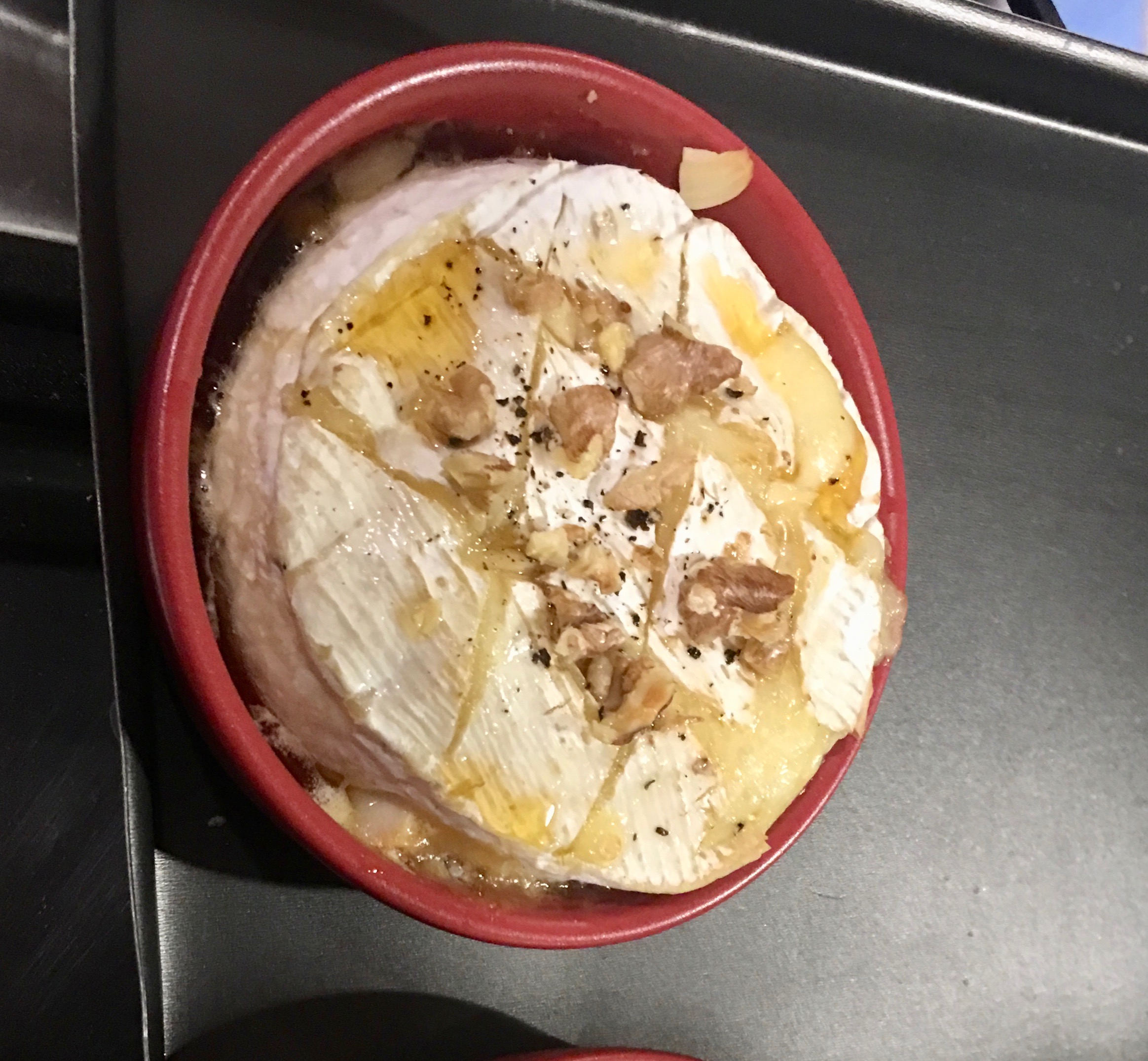 Camembert cheese with honey, drizzle of oil and walnuts for the salad