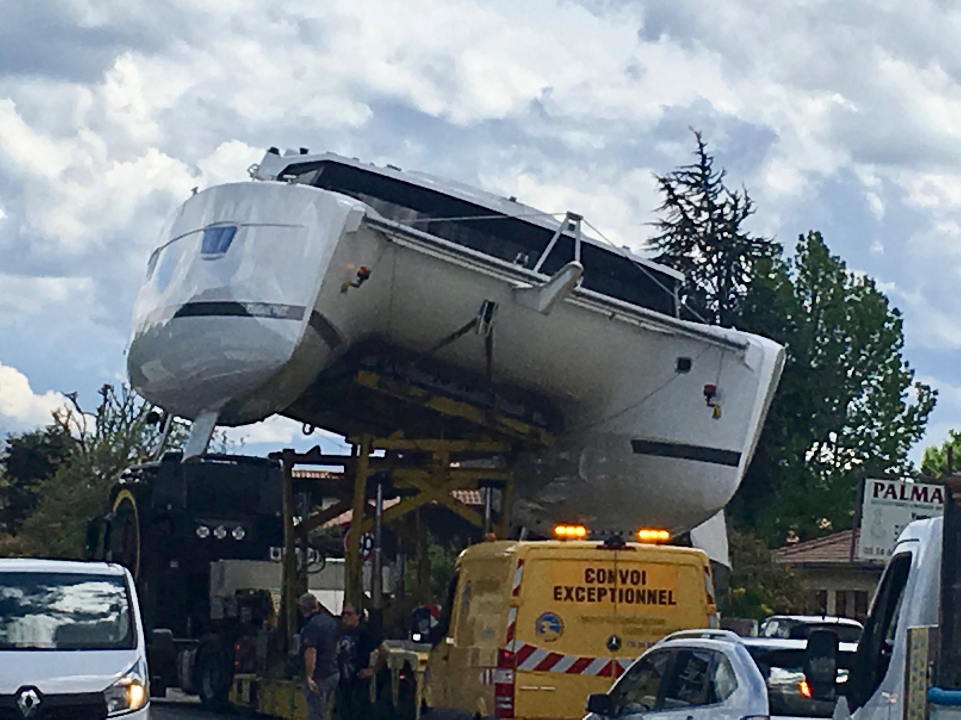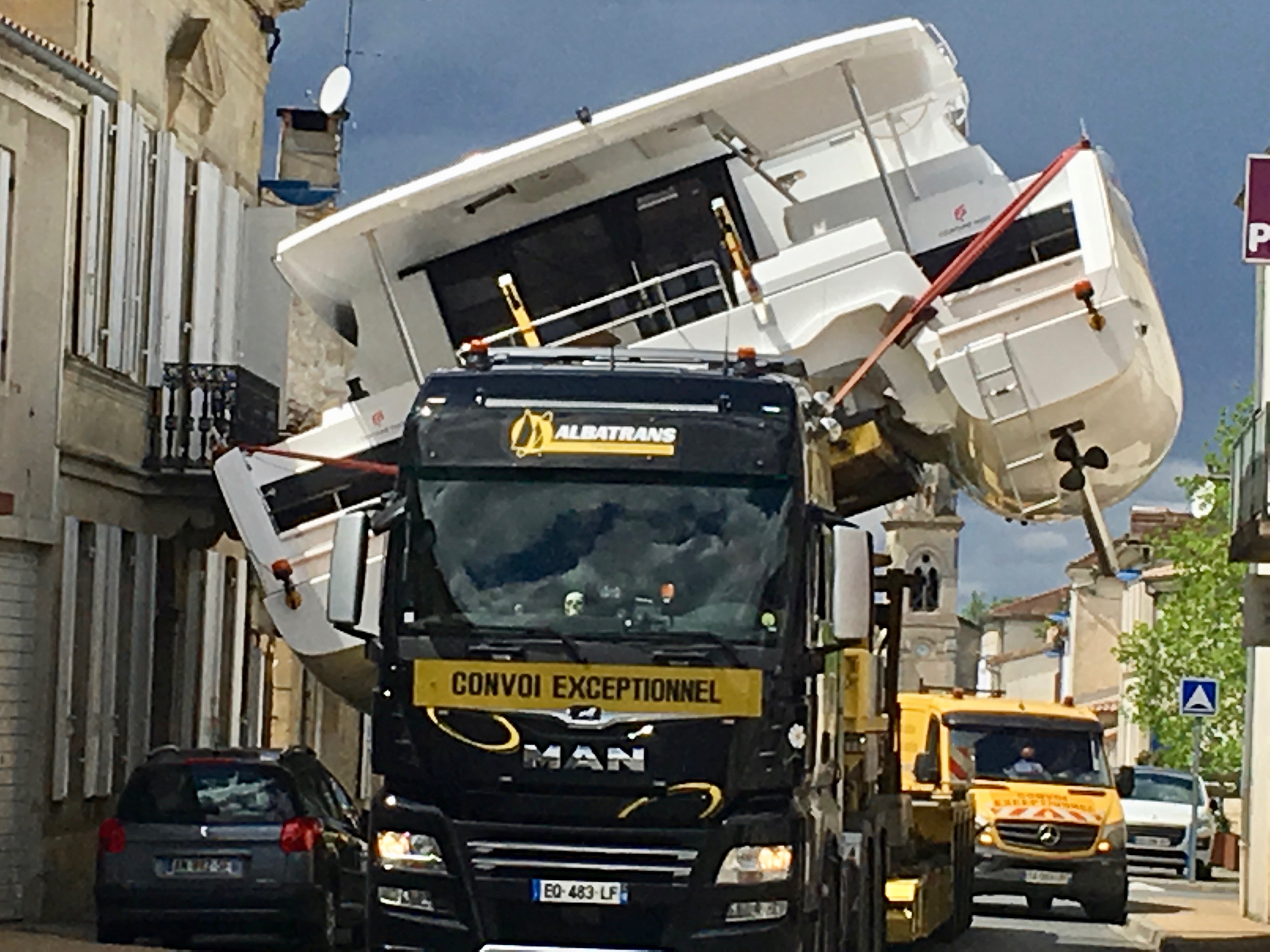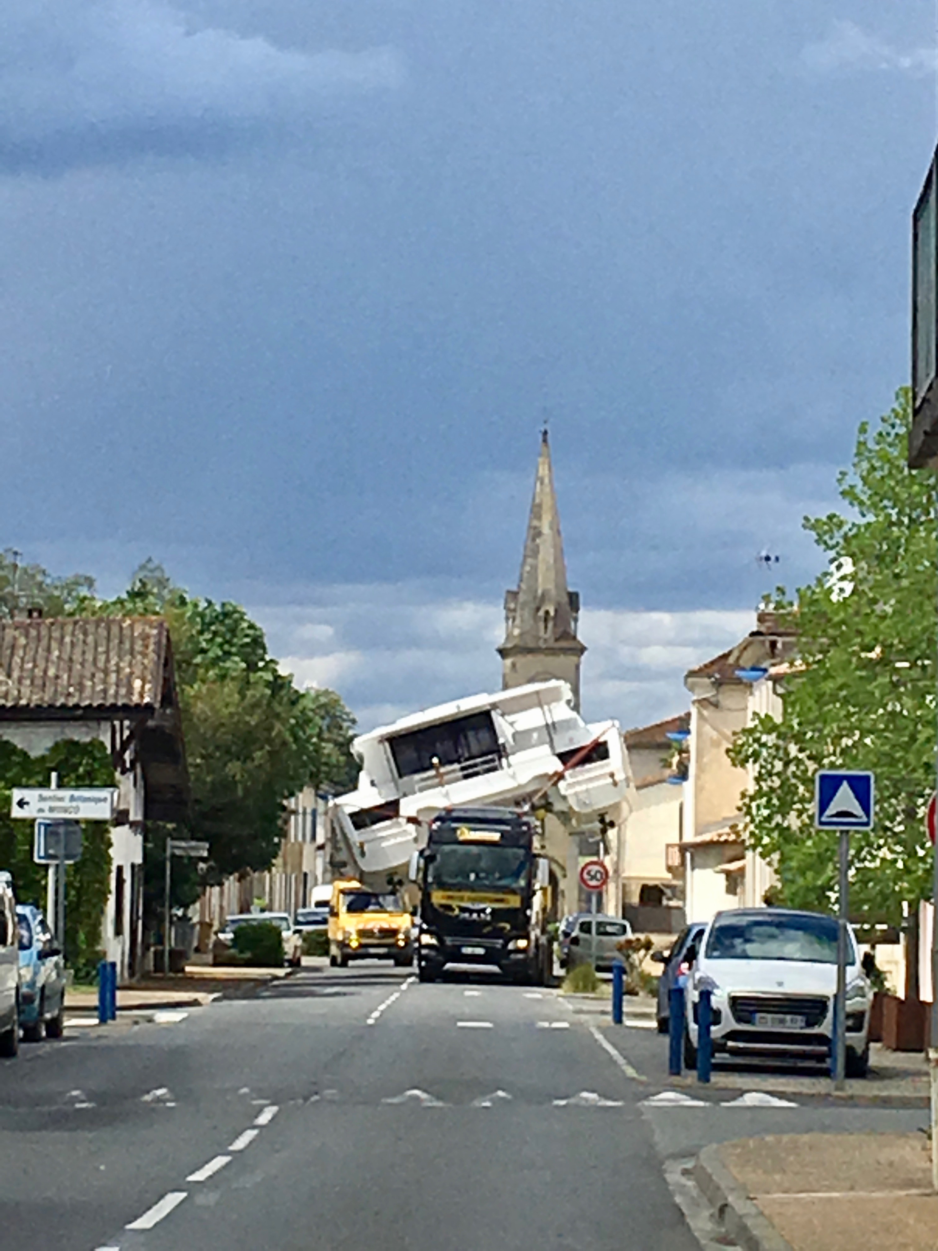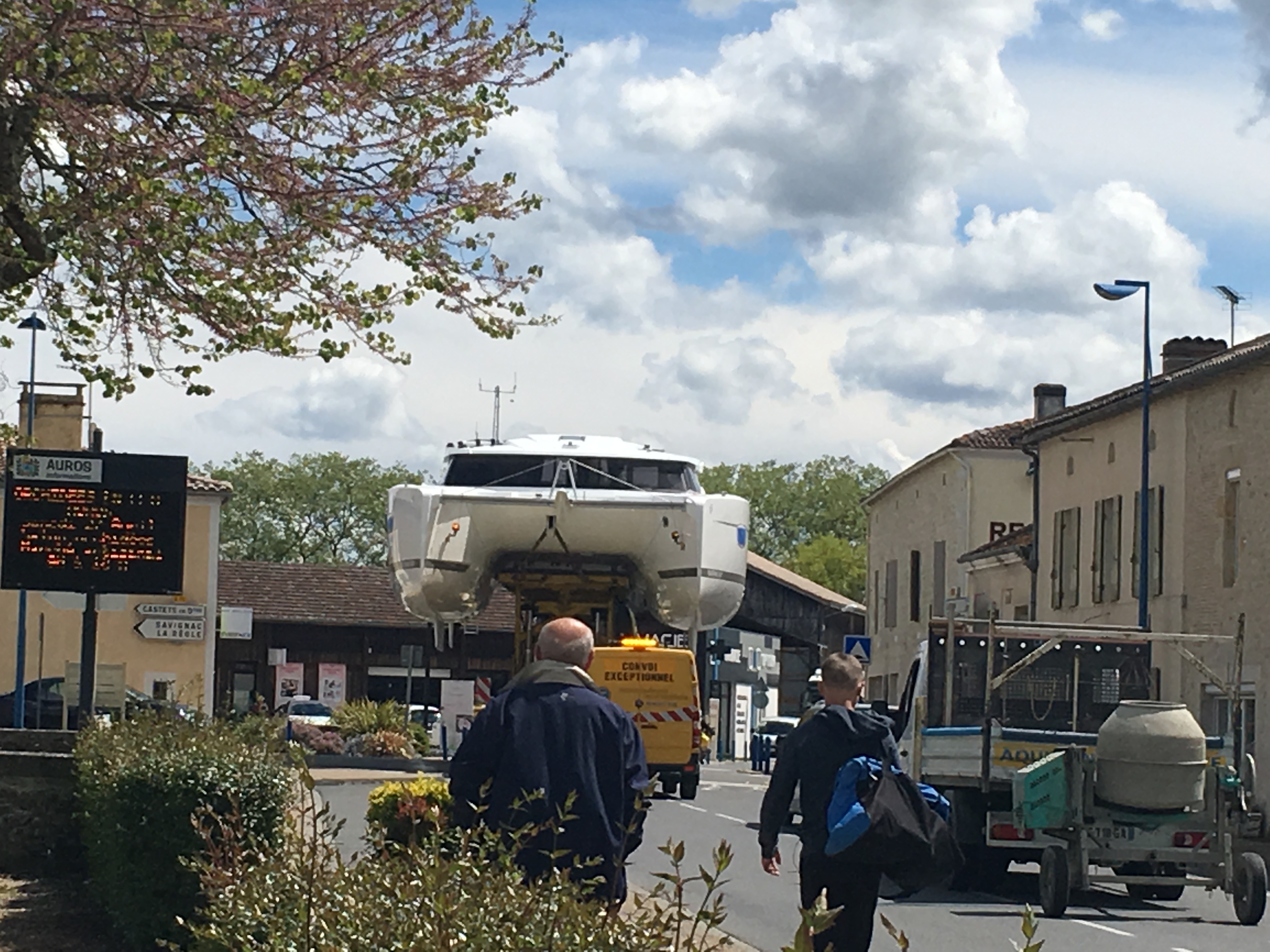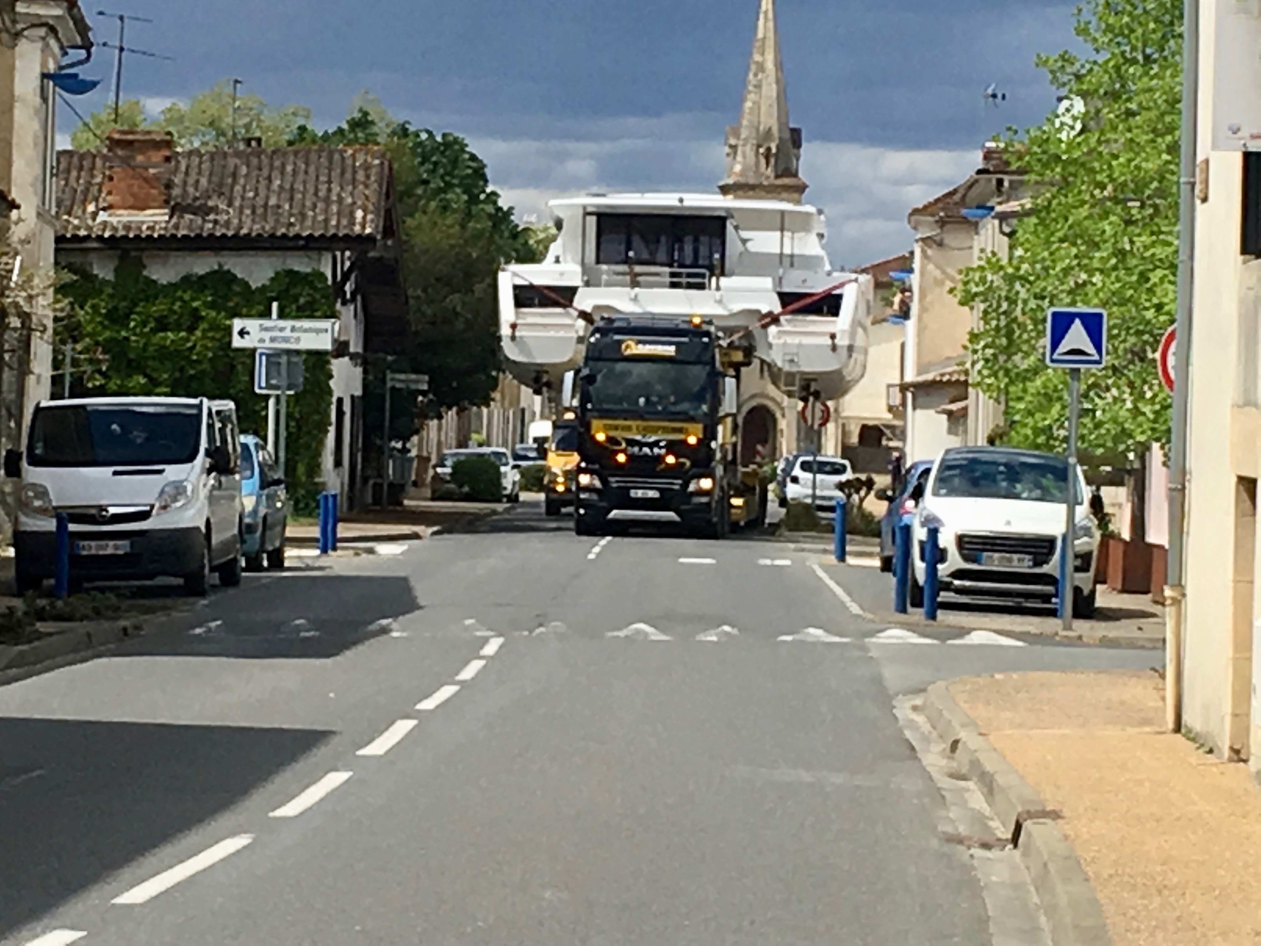 Thursday, April 25 was a day for us to rest and catch our breath. We had been busy and it felt good to just take it easy. We went for a walk to the bank and heard a big noise from a truck. We turned around and saw this amazing sight. A huge catamaran coming down the street. It wasn’t just coming straight ahead but tipping sideways to avoid cars, street signs and trees. Then down again when there was room. It was truly a sight to see. They don’t want these boats on the major freeways so they send them through the small towns on their way to Bordeaux to launch into the Atlantic Ocean.