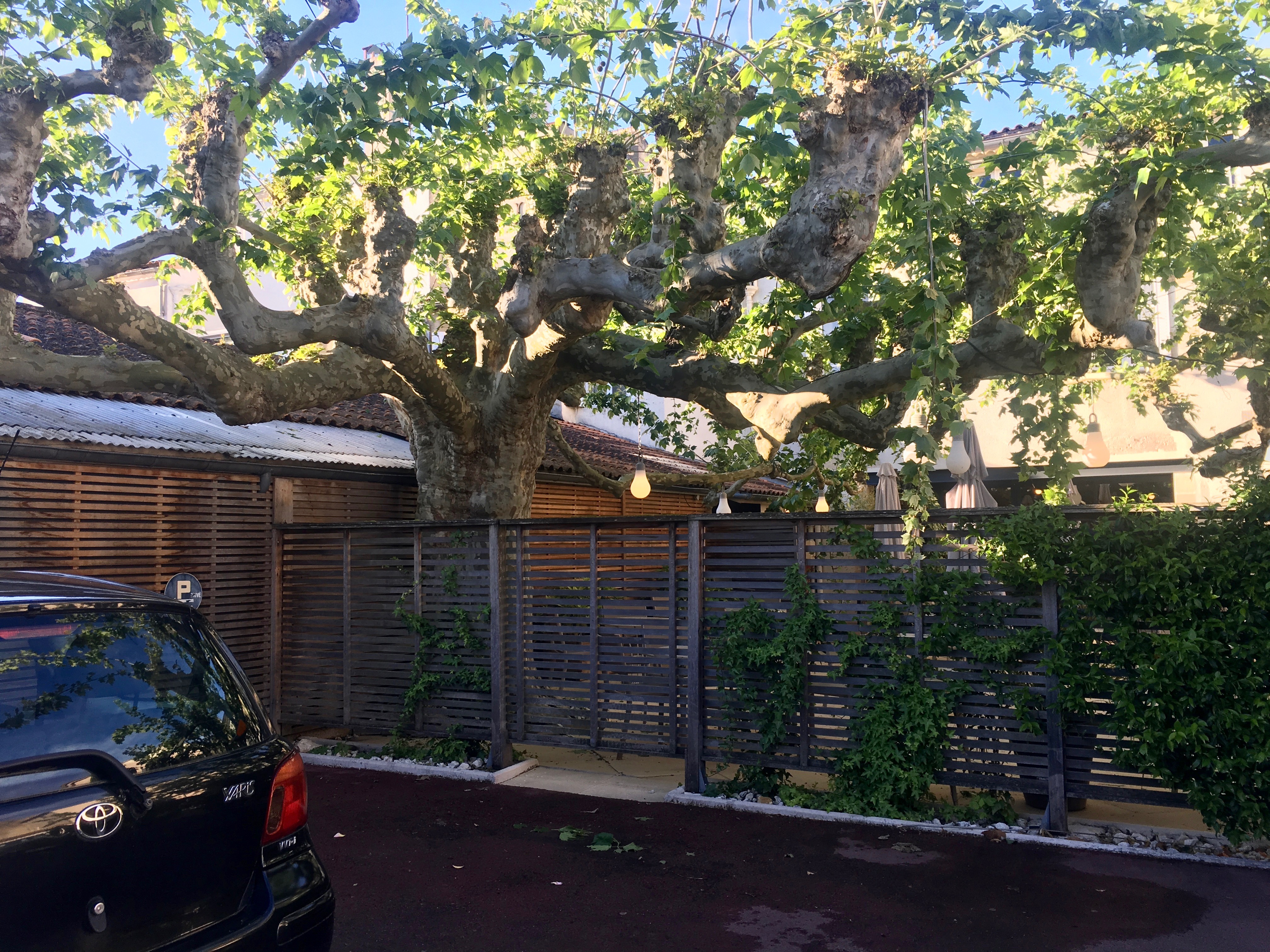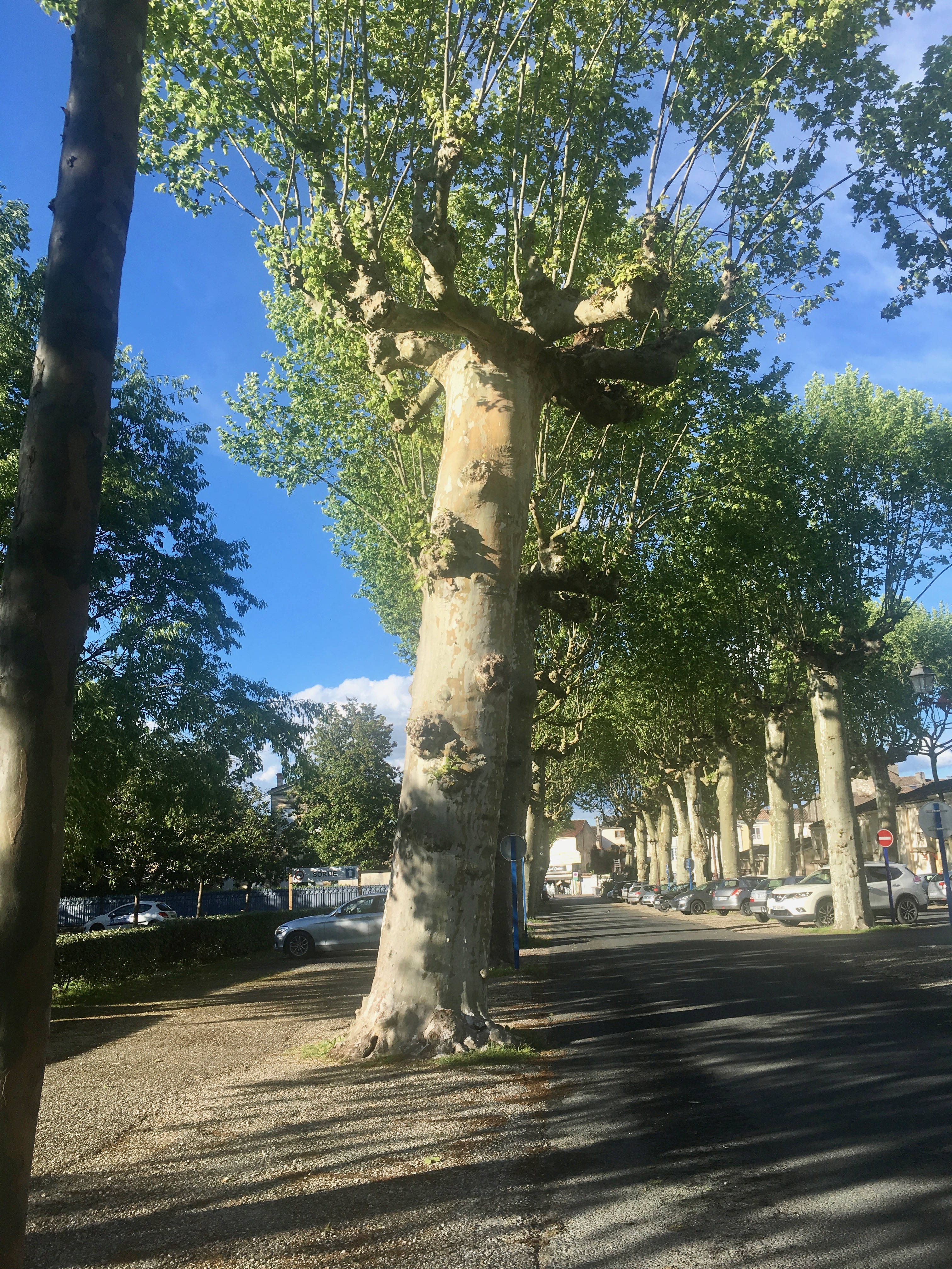 We went into Langon for dinner at restaurant Claude Darroze, a Michelin Guide restaurant. We walked around Langon and saw some beautiful Plain trees. Plain trees can live up to 400 years old. Napoleon ordered the lining of roads with Plane trees (and other tall trees like Ash, Elms and Chestnuts) to provide ample shade for his marching troops. These trees have a dappled trunk and provide a canopy of shade in the summer.