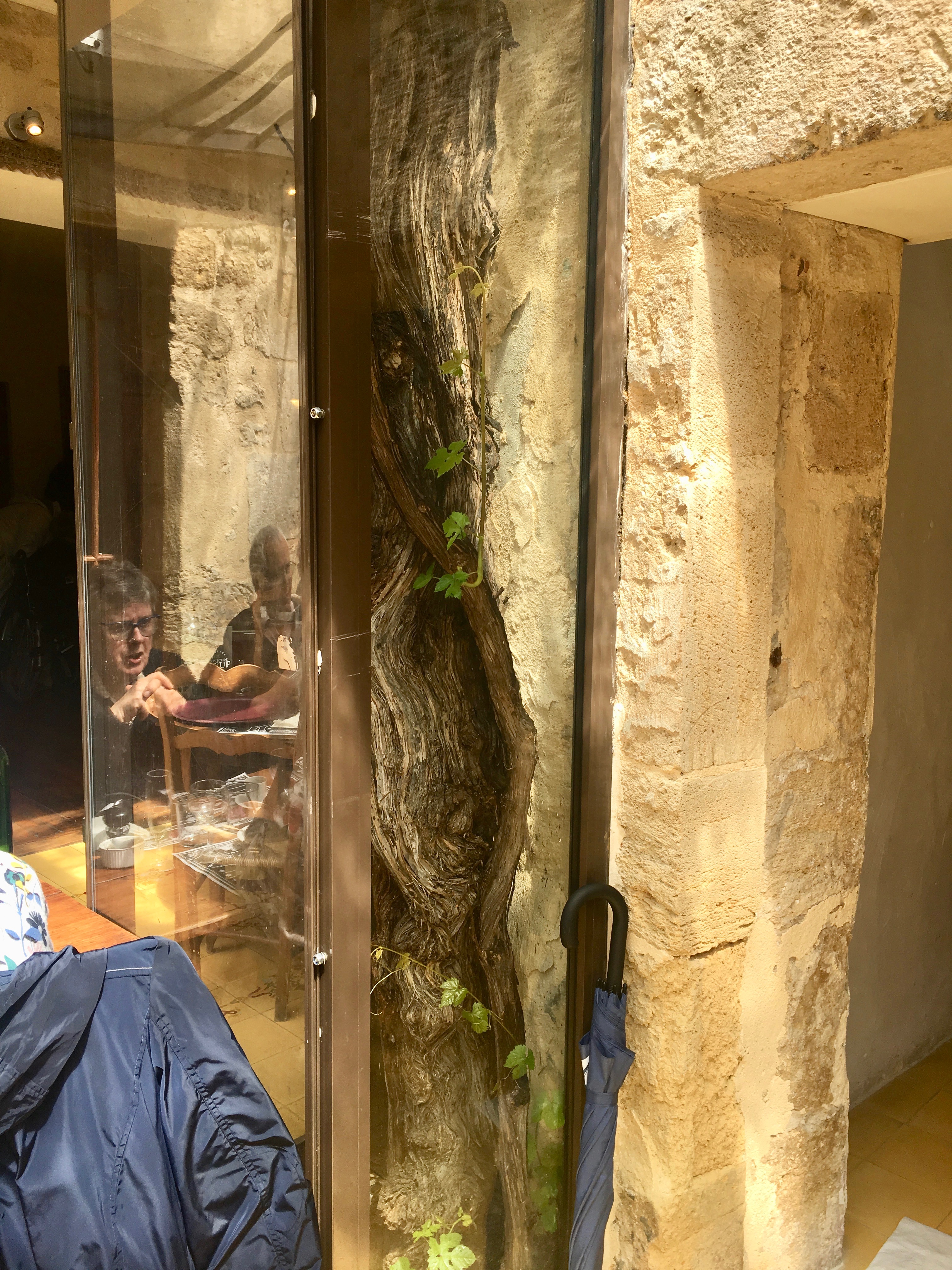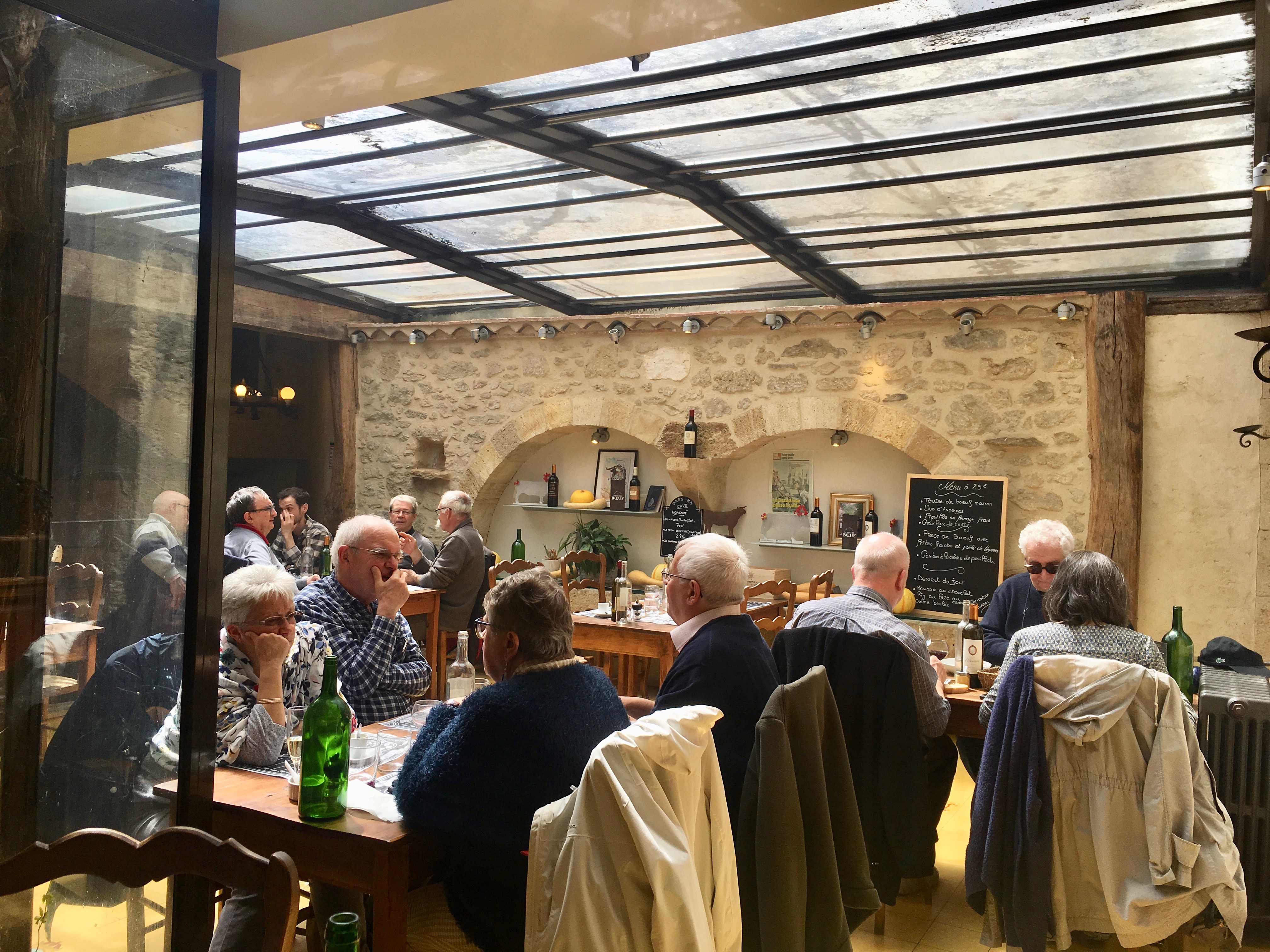 Restaurant La Piece de Boeuf. A nice spot on a rainy day. They had a glass covered eating area. There is a 200 year old grape vine that covers the glass to provide shade in the summer.