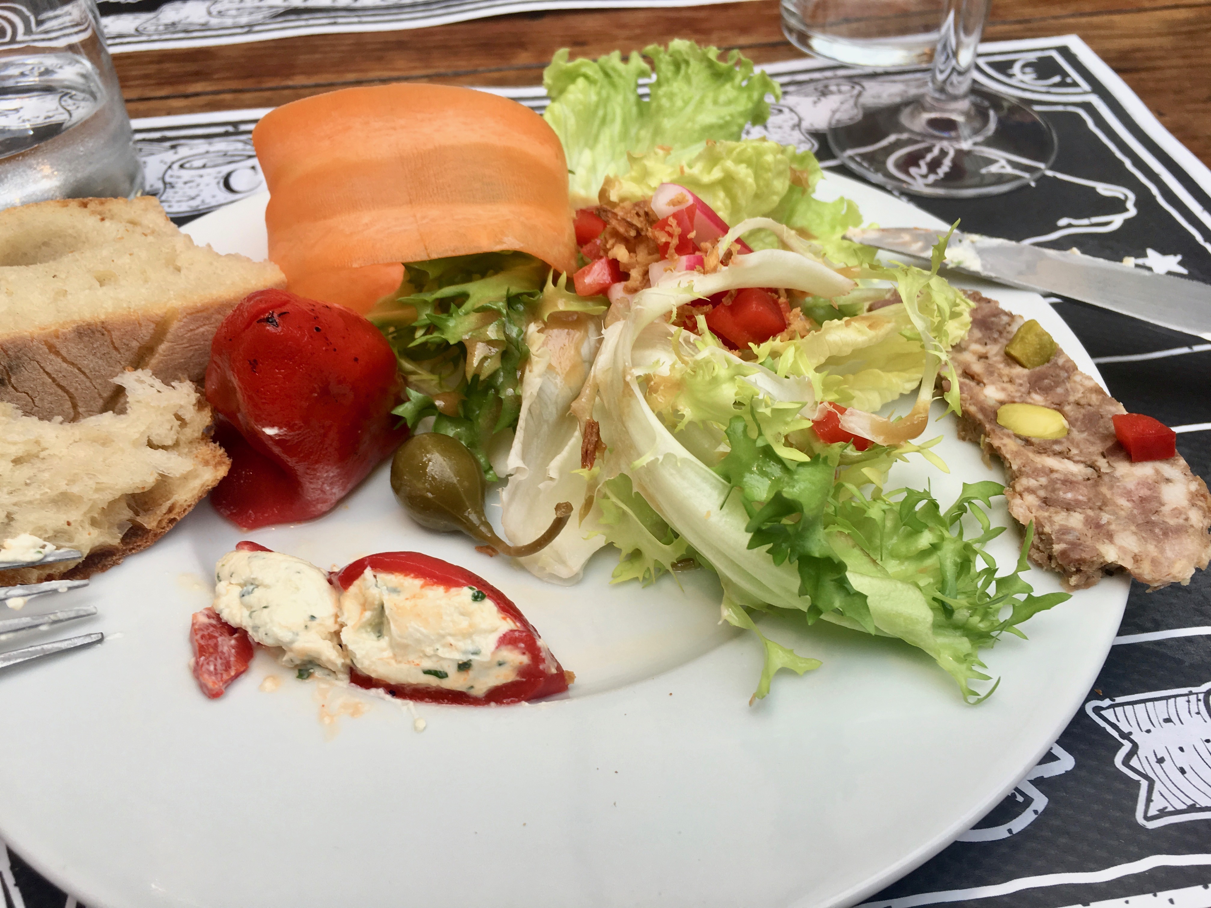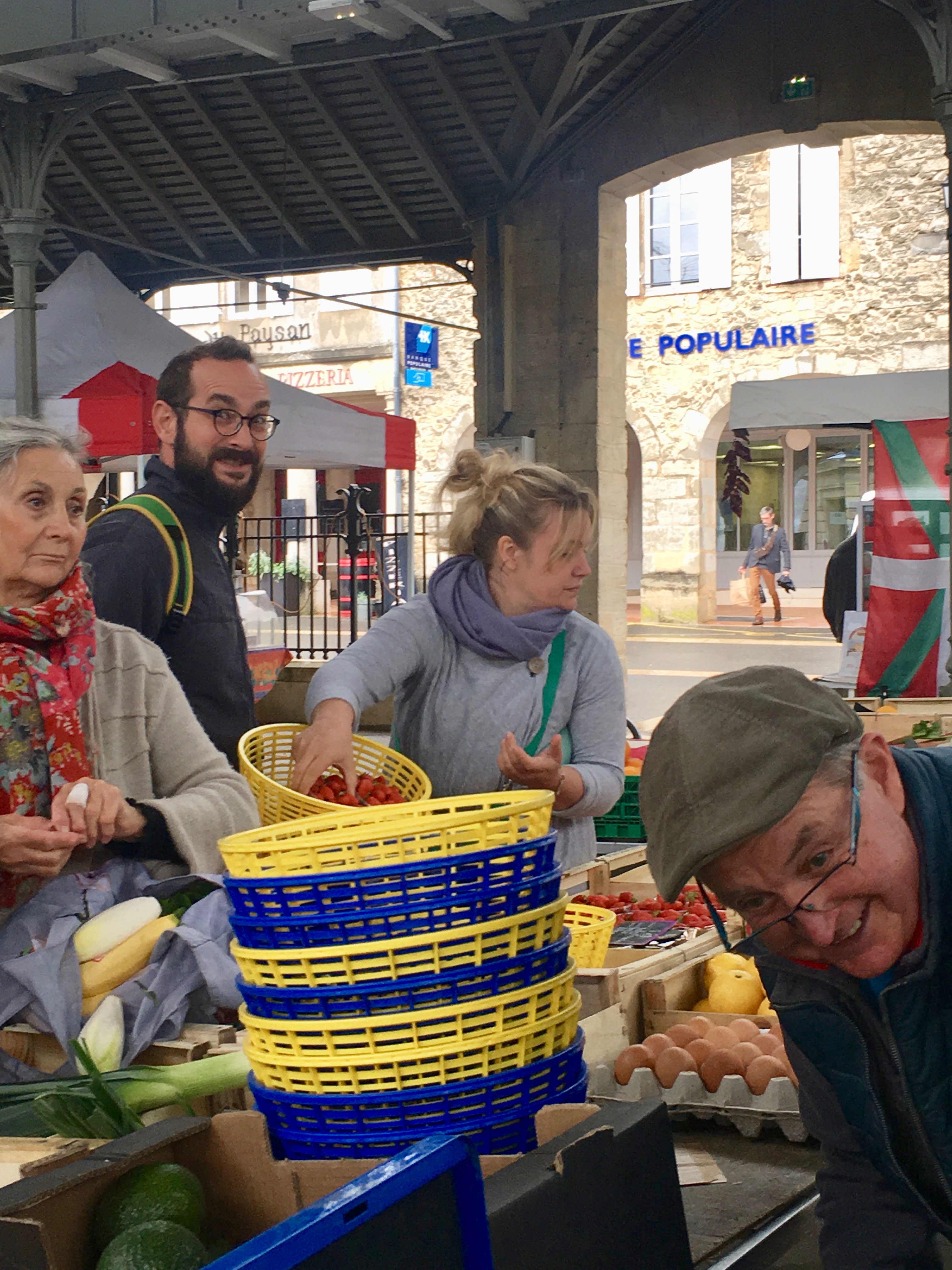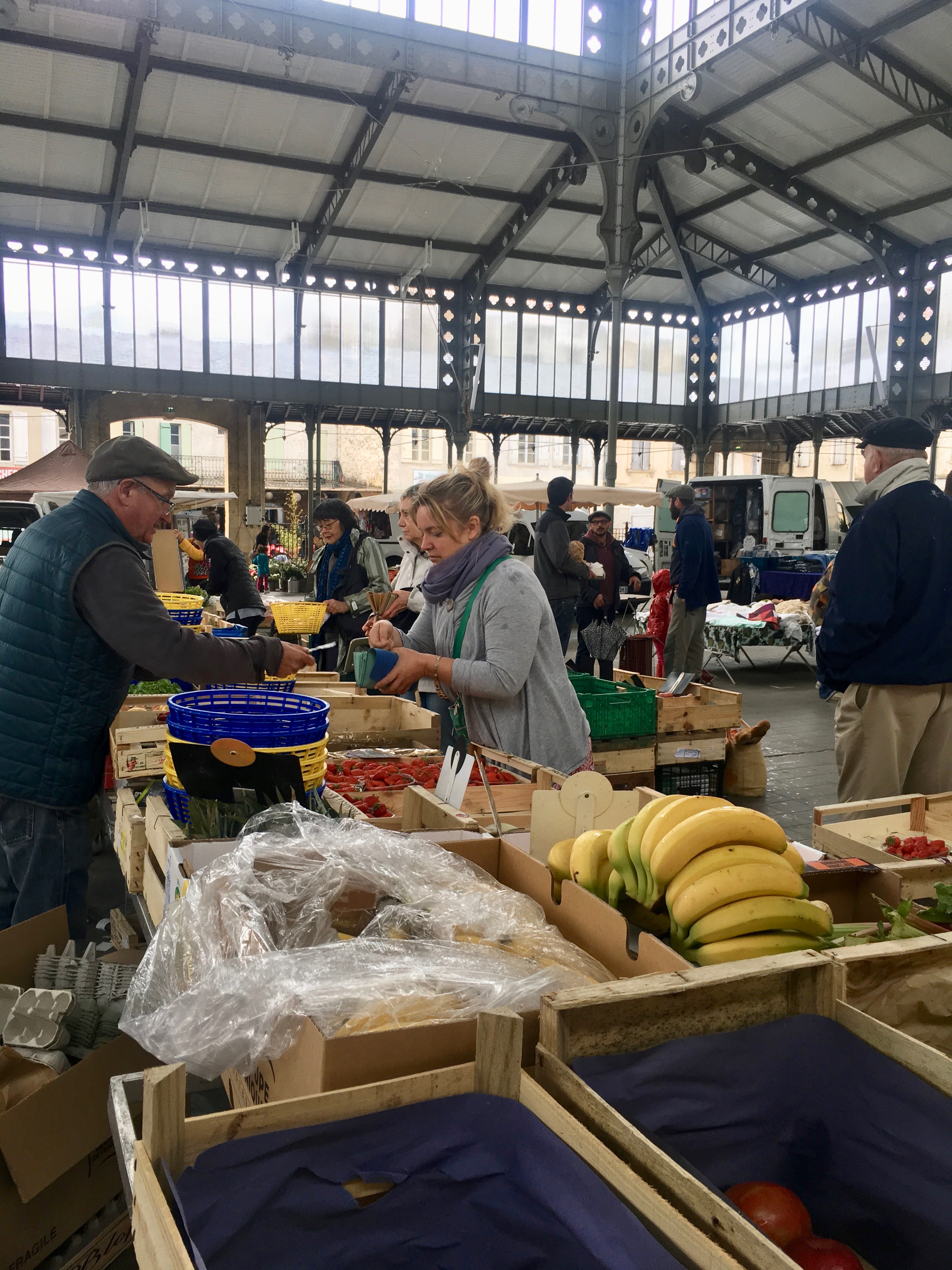 On Saturday for dinner Julien was going to be making a chicken dinner for his family and we were invited too! We had to pick some things up for the meal but first we headed to lunch in Monsegur to a restaurant, La Piece de Boeuf, that Ludovic recommended. Low and behold they had a covered market and we could get most of what we needed.