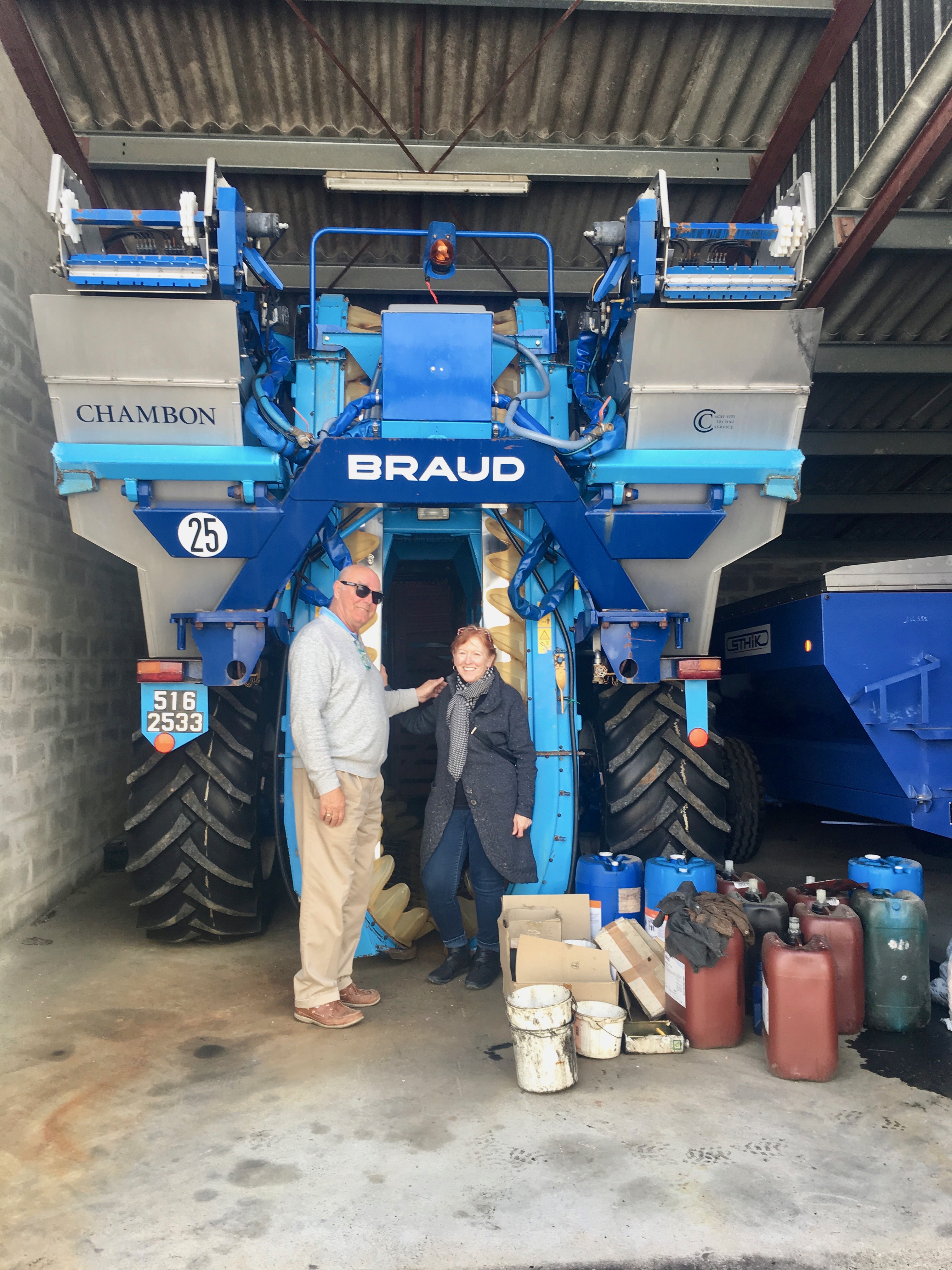 Mary and Scott in front of the mechanical harvester. Even if I am short, it is still a big machine!
