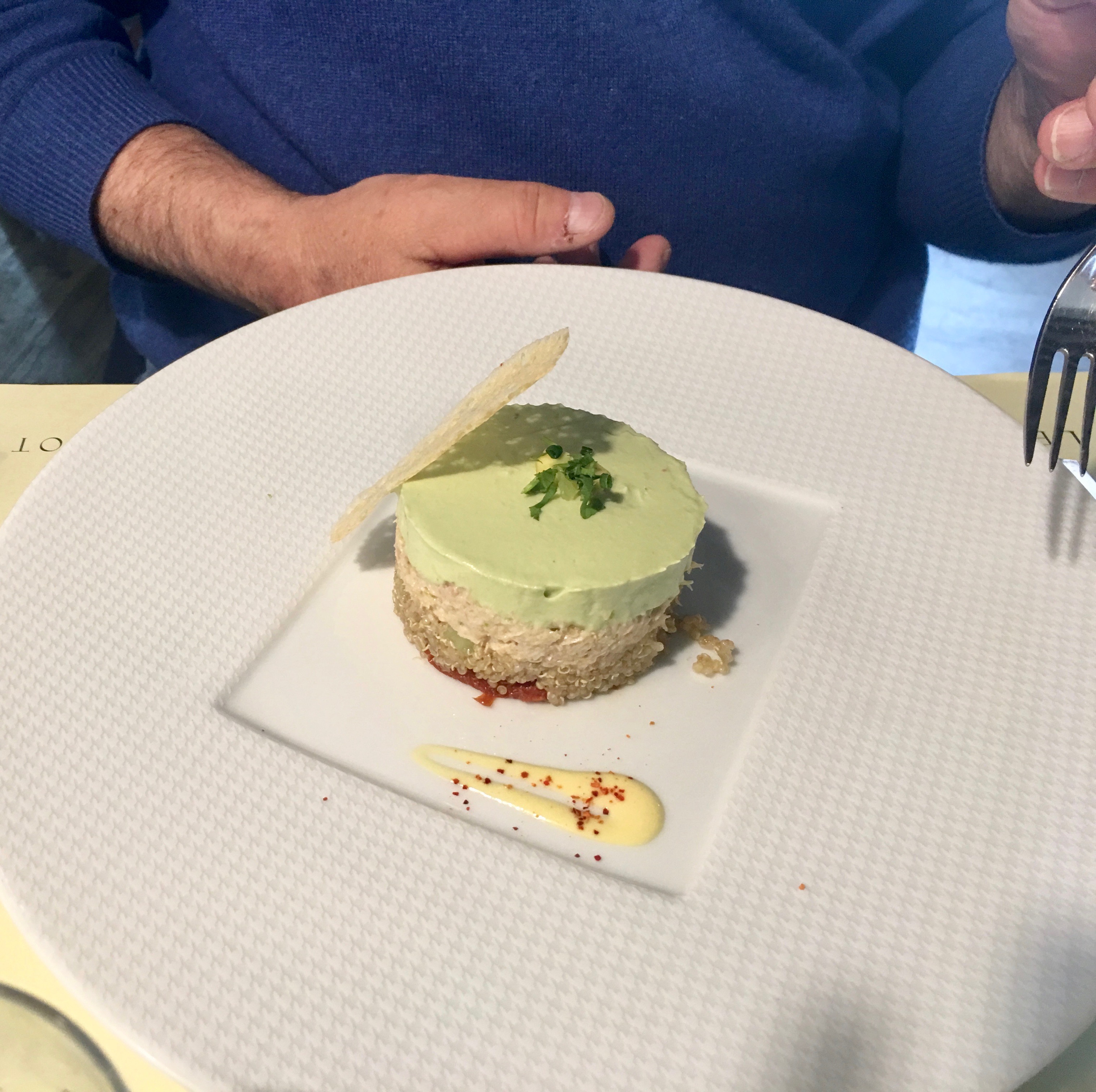 Avacado mouse over crab and tabbouleh