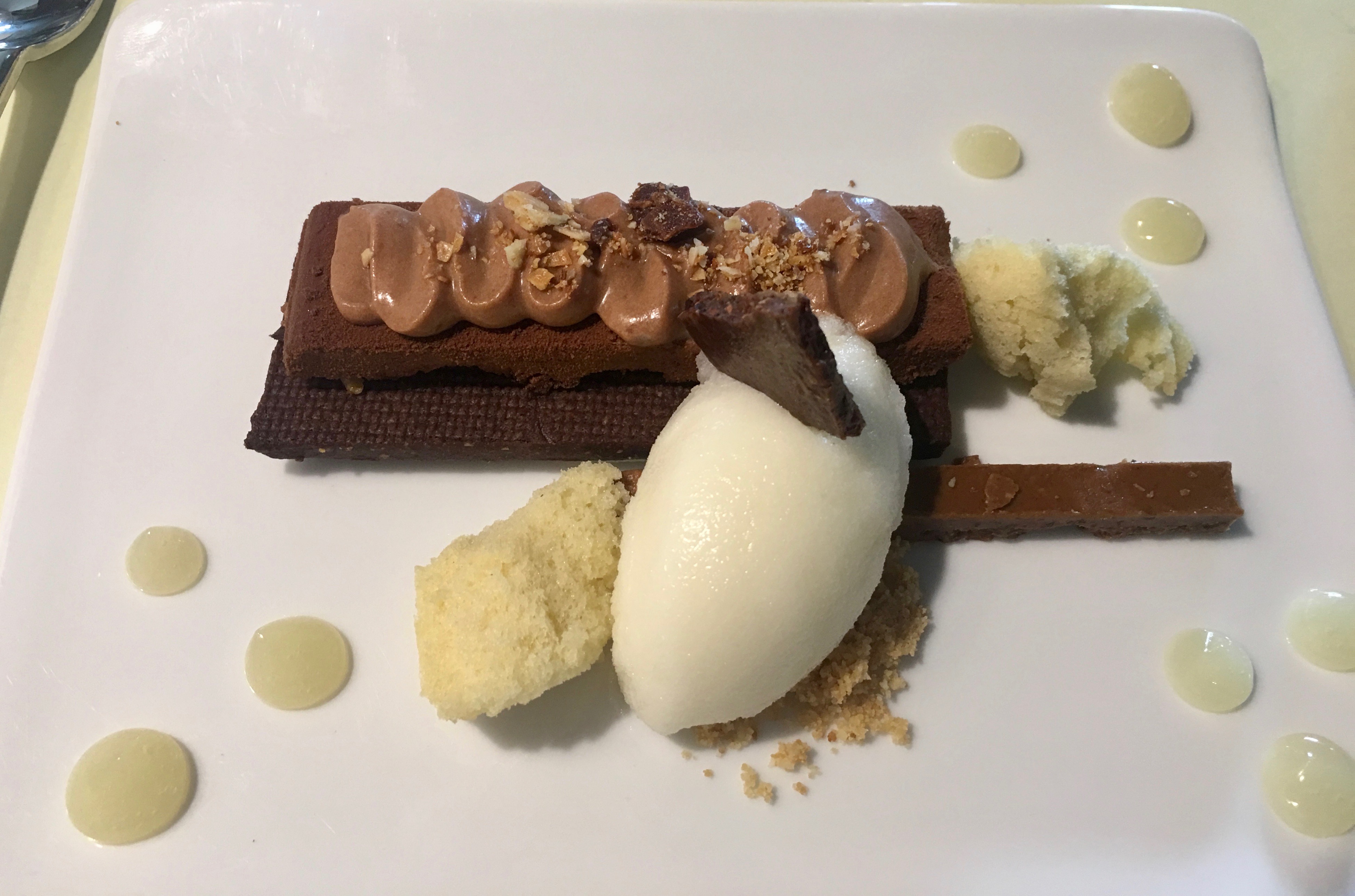 Chocolate mousse on a praline cracker, creamy carmel and lemon sorbet