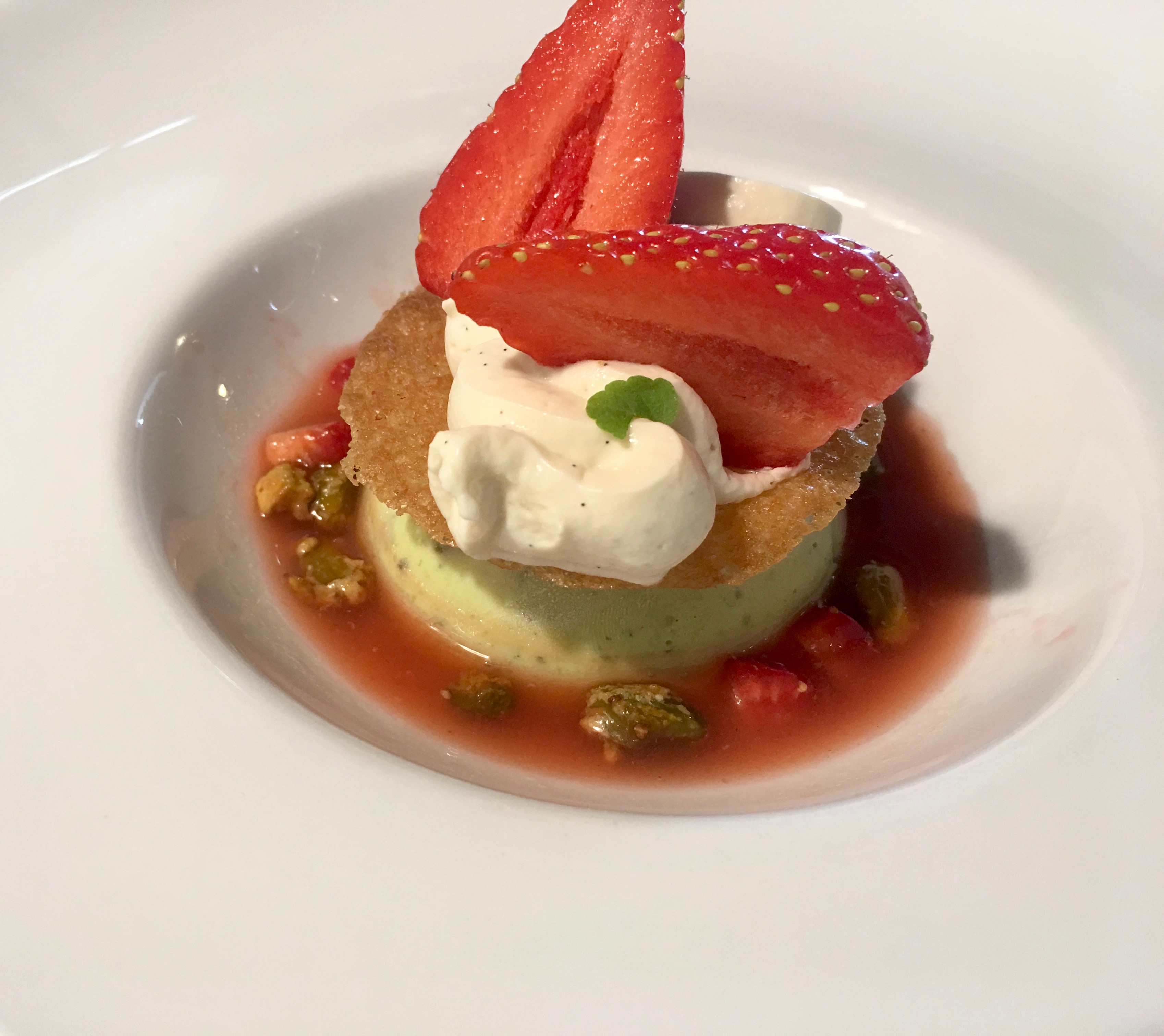 Pistachio, iced parfait, spiced strawberries infusion and creamy mascarpone