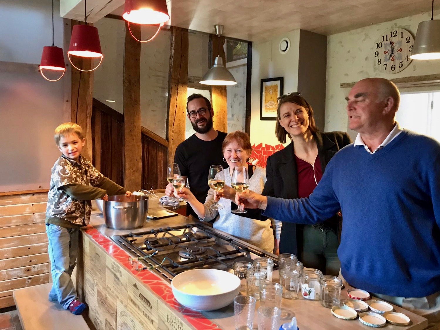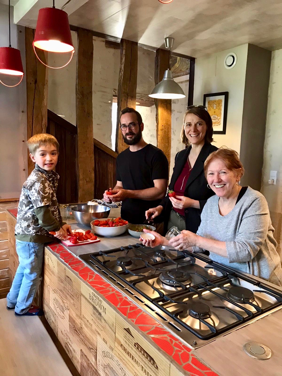 So, you might ask, what should we do? Well, make strawberry jam of course! Isabelle brought over some very wonderful strawberries. If I haven’t said so before, France has the most wonderful strawberries. They are narrow instead of round and have the most wonderful flavor. I bought them in the market several times. I suppose that is the main reason they are so sweet and good. Anyway we all helped de-stem the berries, cut them and wash the jars. Julien added his special touch. He put some lime zest and lime juice in the berries while they cooked. It added a wonderful flavor.