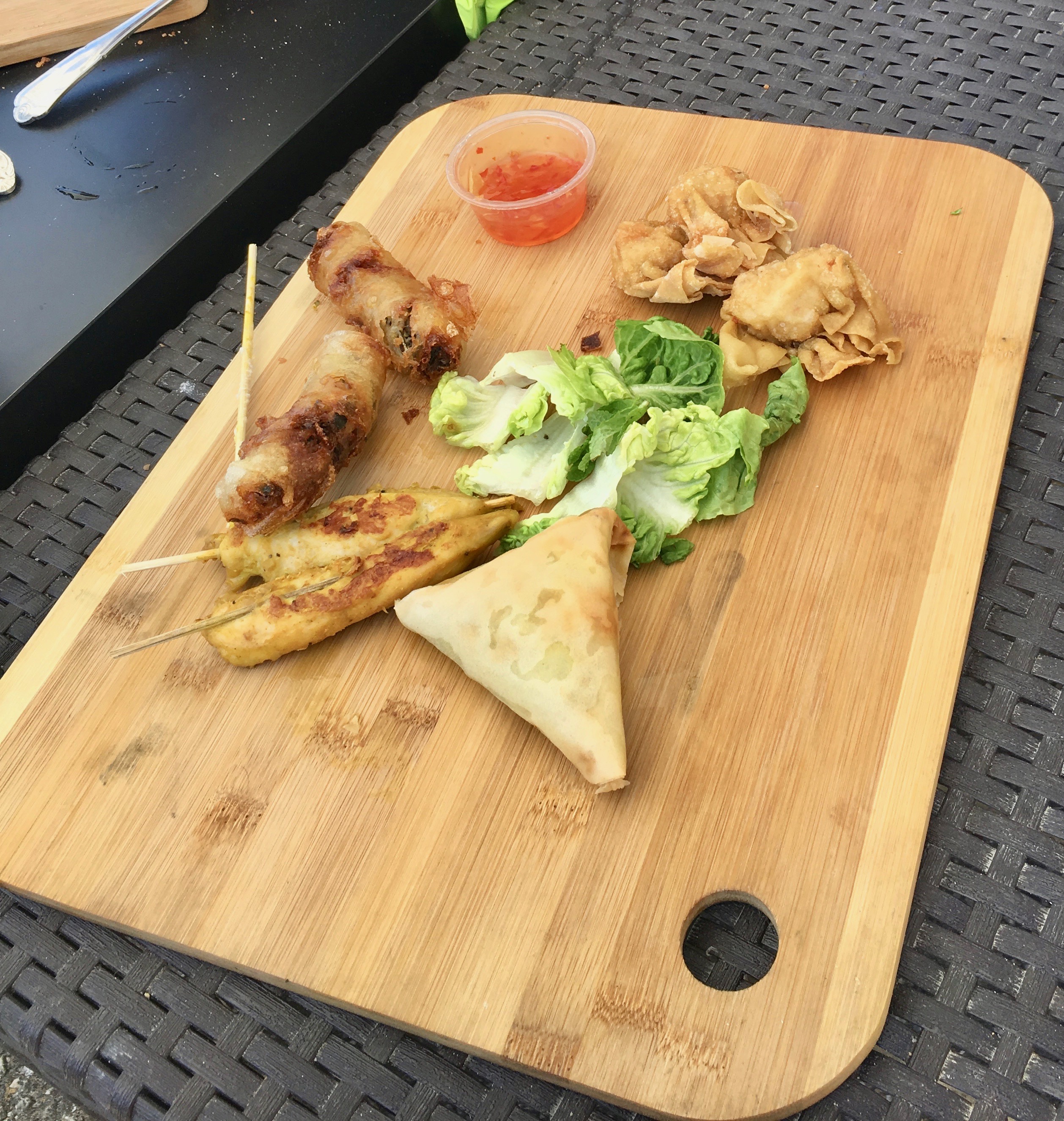 They usually serve oysters but they had a large party the night before and the oysters were all gone. So they improvised with an Asian menu of chicken satay, egg rolls, fried wontons, and cheese puffs. Our lunch was great, the wine was good but the company was even better!