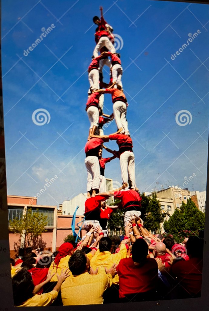Thousands of people pack the streets and the square to see the Castellers. The aim of the Castellers is to build a human tower and have a young child climb to the top of the tower and stand up. It requires a tremendous amount of planning and teamwork to build a human tower and it is quite an amazing sight to see. It is a competition and each group represents a different neighborhood and tries to get higher than the next. The tower has three parts: The base which is largest and stabilizes the structure. Next are the rings which have specific number of people depending on the height. Finally, the tower dome. The smallest and lightest person is on top. That person has to raise their arms to salute the crowd. Rosa explained that the tower depends on the base which represents the cooperation we all need to survive. Unfortunately, the square was so packed we could only see a smaller version of one of the towers. This photo is from the internet.