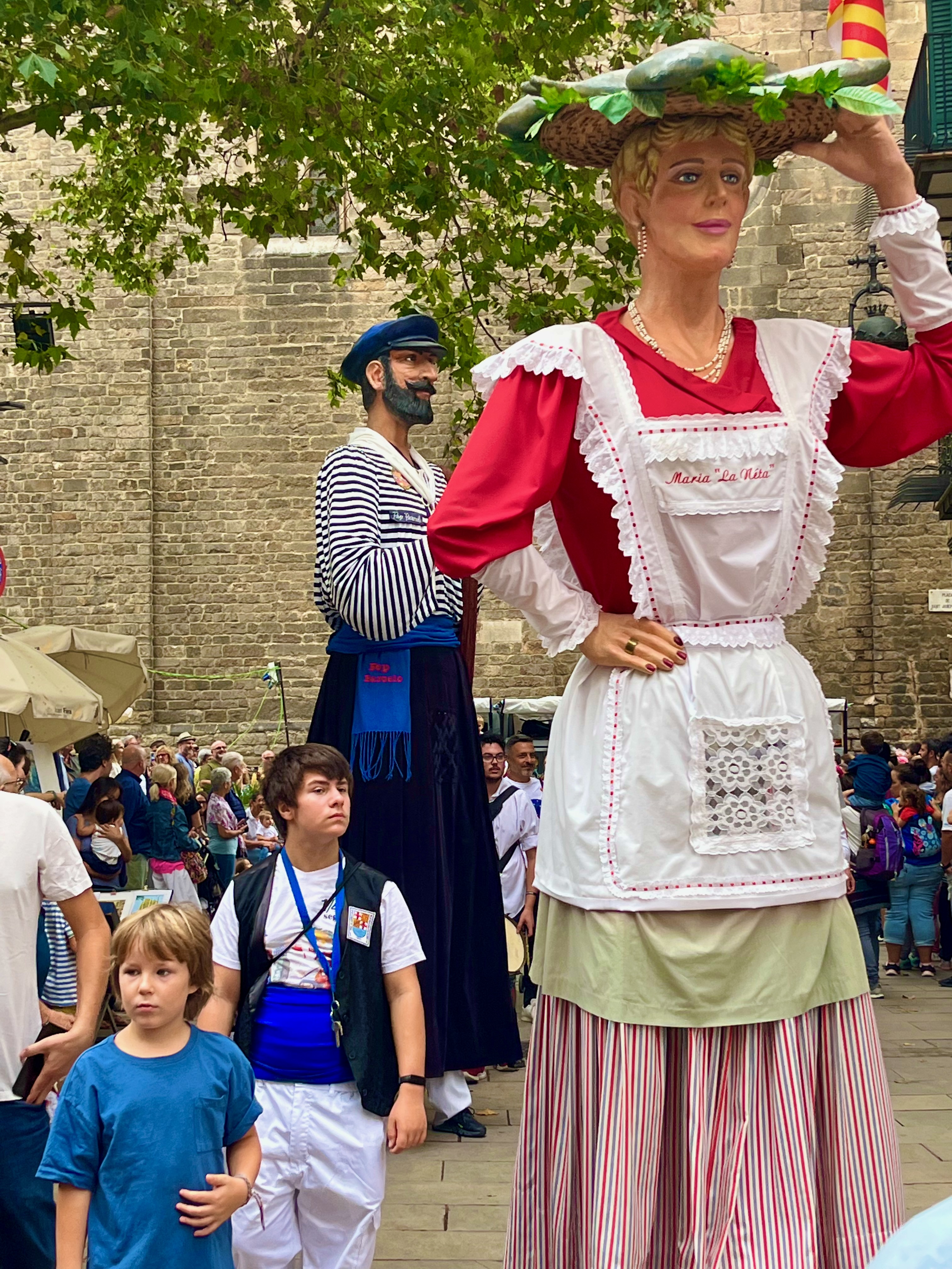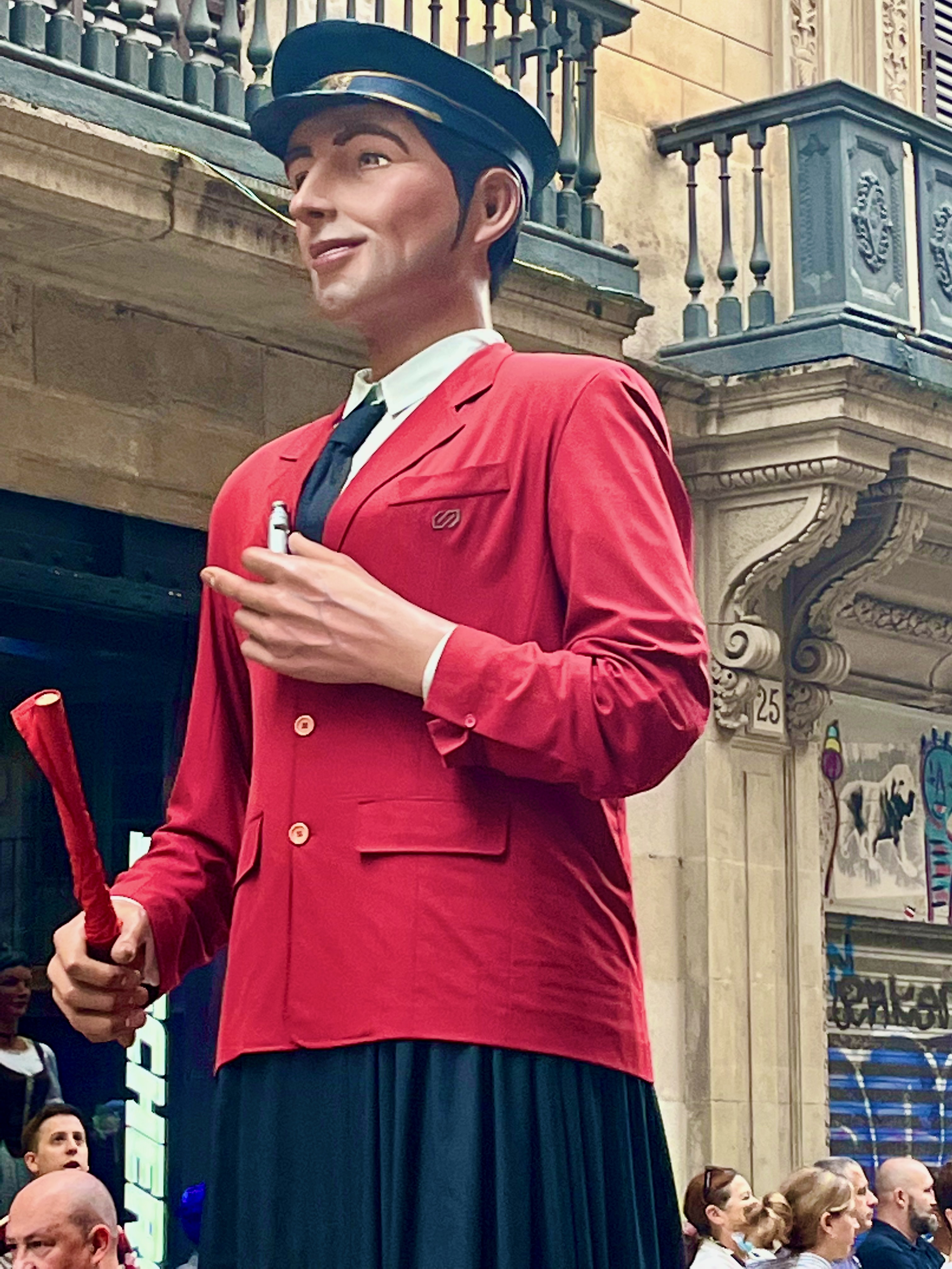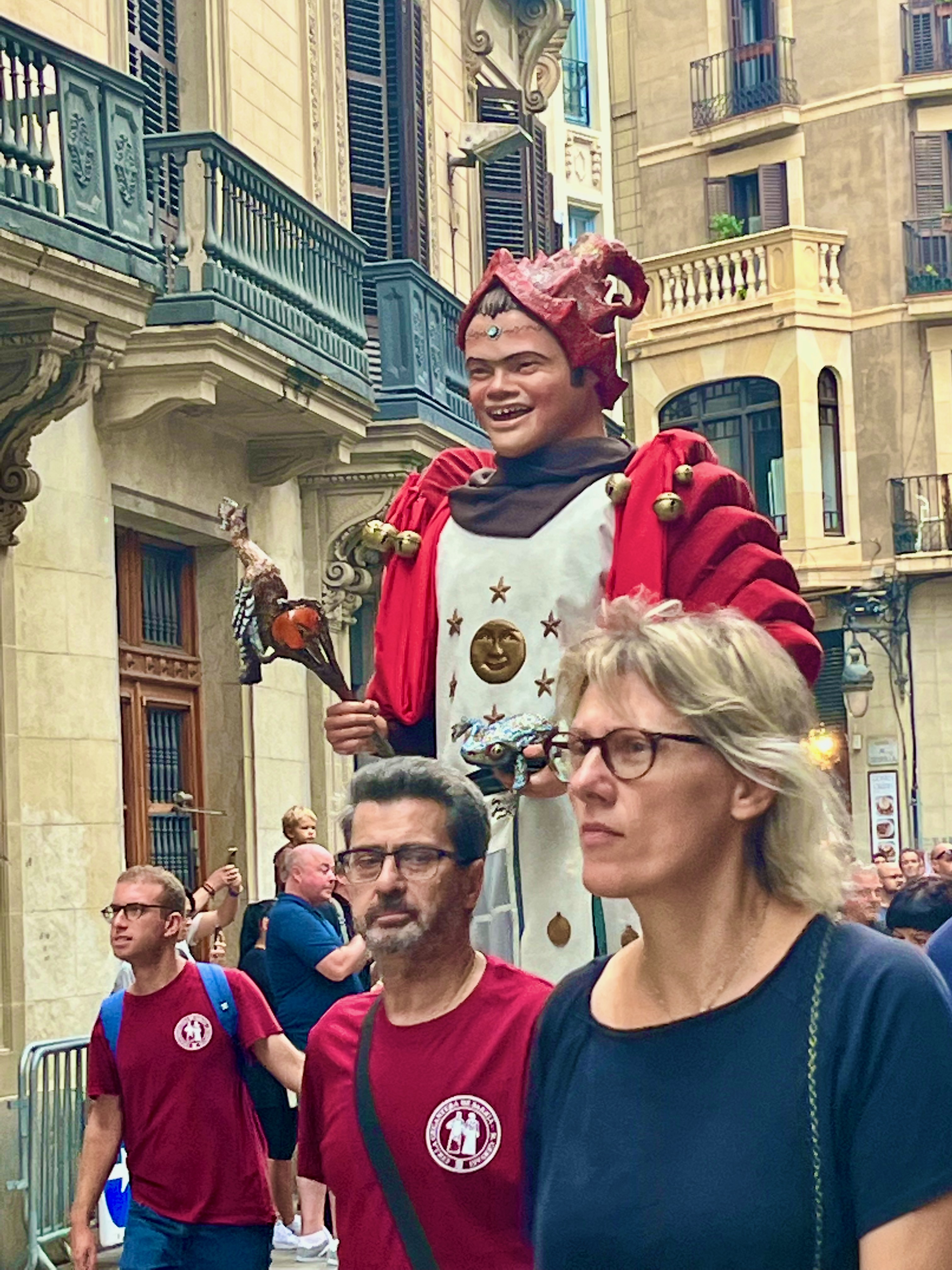 The Giants parade is a popular event for the whole family. Huge giants with effigies of kings, queens and nobles march through the streets. These huge figures tower above the crowds and spin around and around so the crowds can see them in all their glory. The Parade is often accompanied by small percussion groups that beat out a rhythm on drums as the Giants go by. There are also fat head or Capgrosses. These Giants represent the different neighborhoods of Barcelona. Each Giant is carried by one person and they are heavy. When they stop they are able to sit on a bench which is part of the structure.