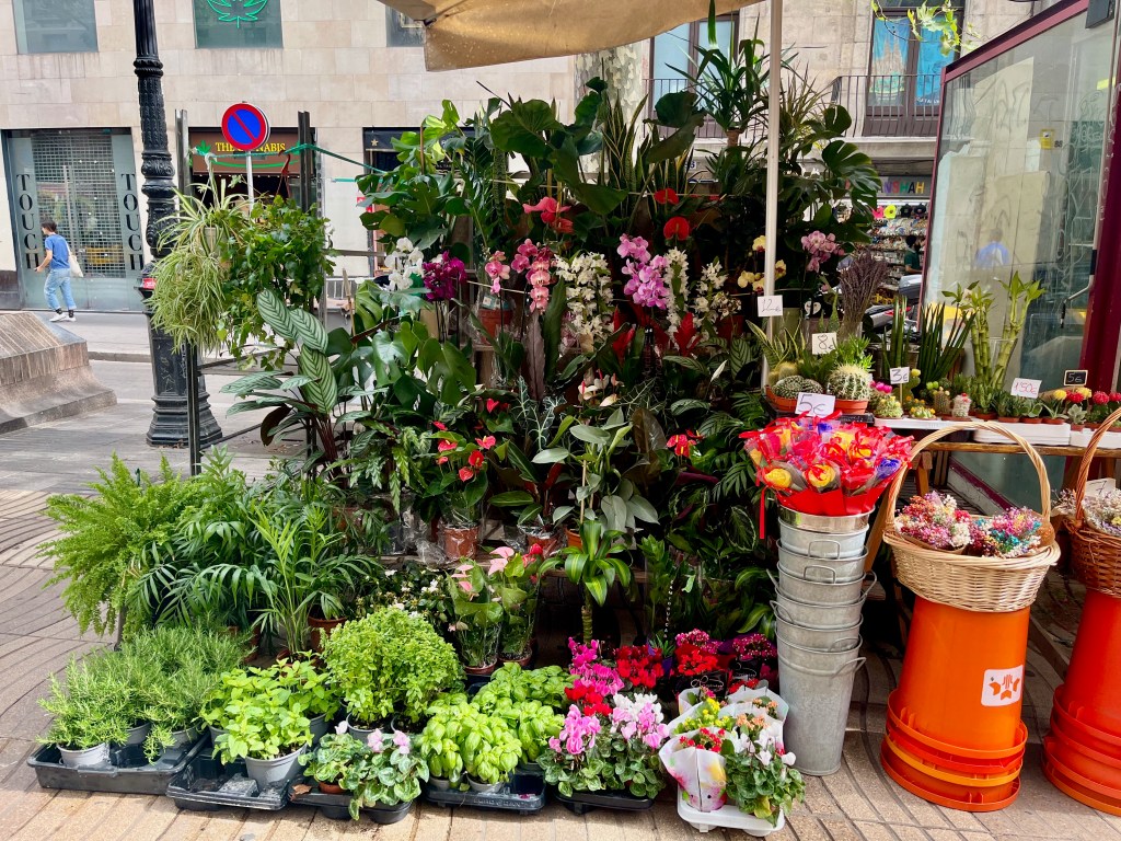We walked further and passed flower stalls, the La Boqueria Market, palaces and church towers. The La Boqueria Market was closed because of the holiday (more later). This market is the largest one and visited by most tourists. We will visit it later.