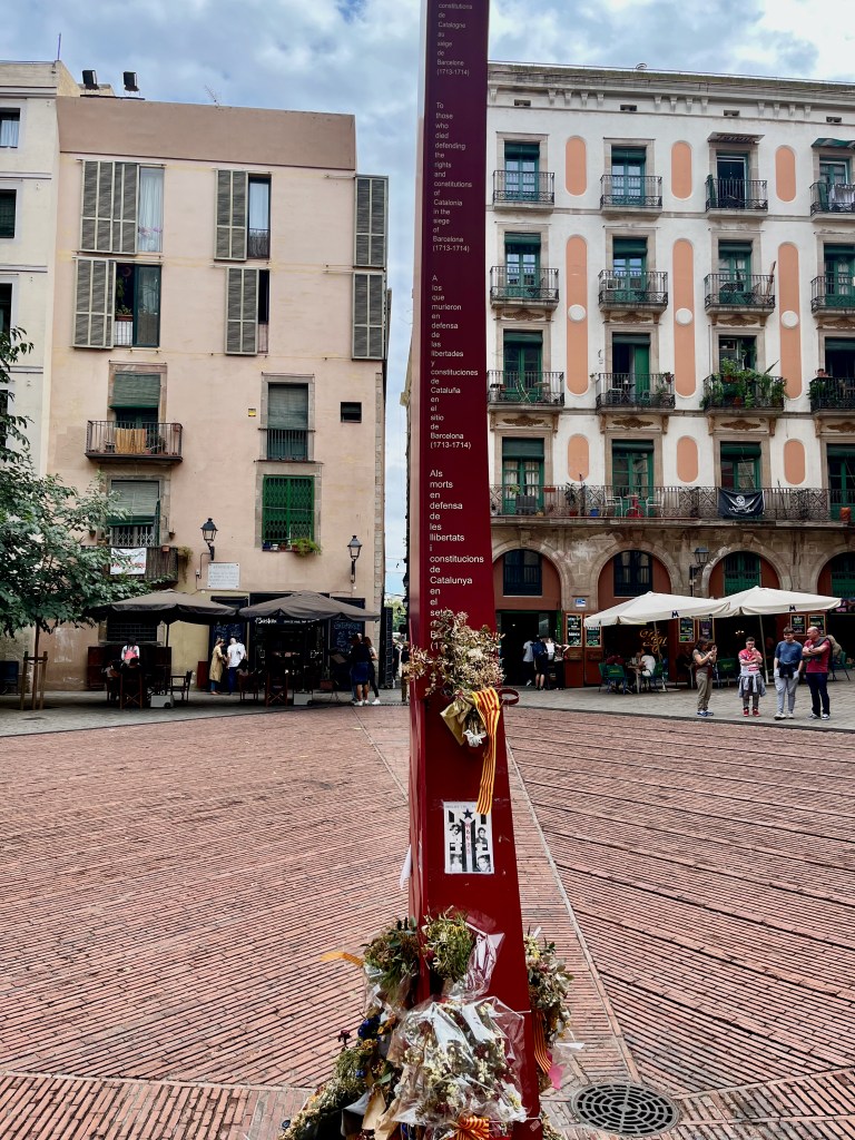This is the Monument of Catalan Independence. The square is called Place del Fossar de les Moreres (The Burial Place of the Mulberry Tree). The lone mulberry tree (see part of the tree on the left above) and modern monument honor a 300 year old massacre which happened in 1714. Catalans still remember this today. The square marks the site of a mass grave of the massacred Catalans. An eternal flame burns atop.