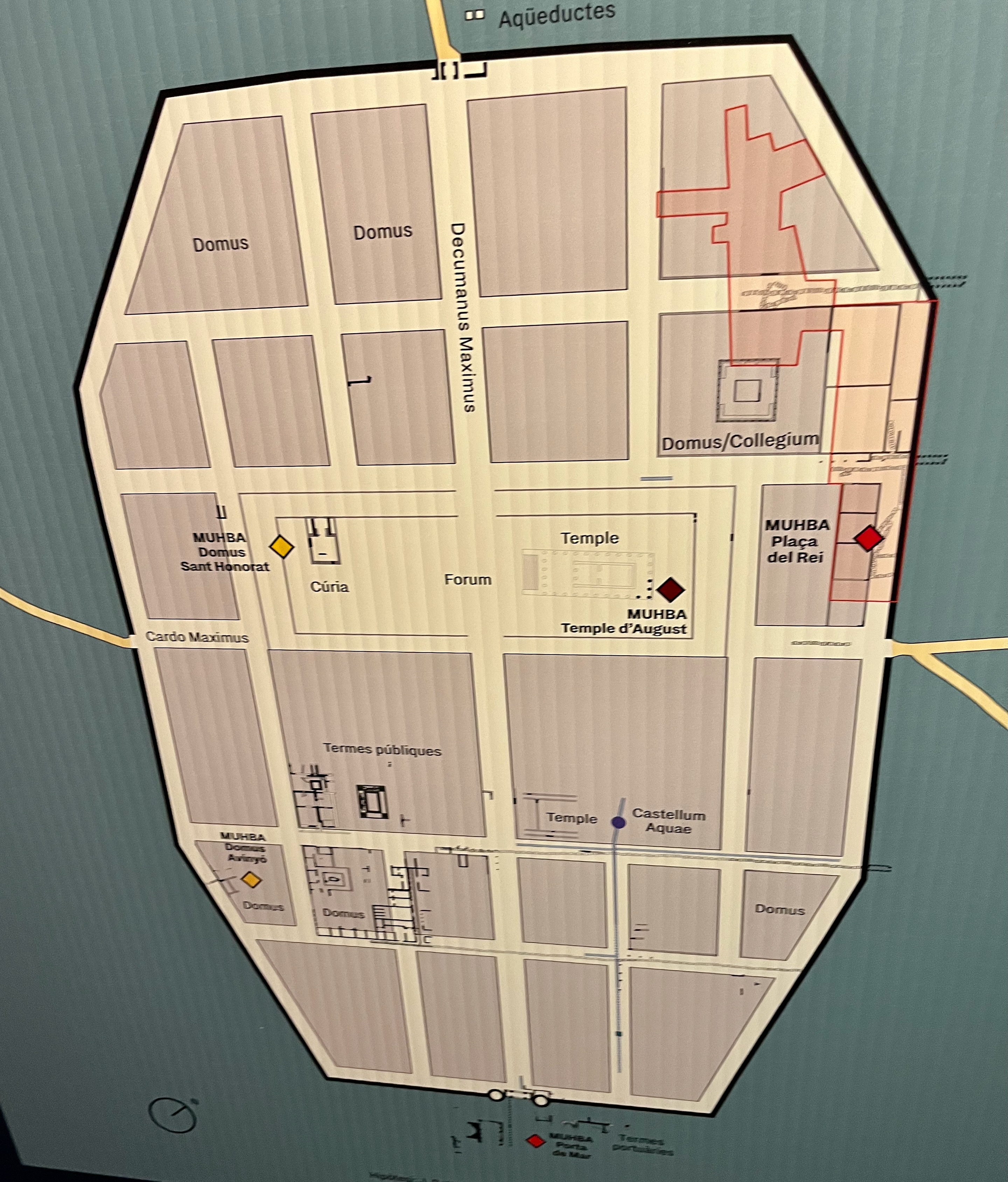 In about 15 BC, the Romans redrew the town as a Roman military camp centered on the “Mons Taber“, a little hill near the Catalan Government and city hall buildings. The Roman Forum, at the crossing of the Cardo Maximus and Decumanus Maximus was approximately placed where current Placa de Sant Jaume is. Thus, the political center of the city Catalonia.