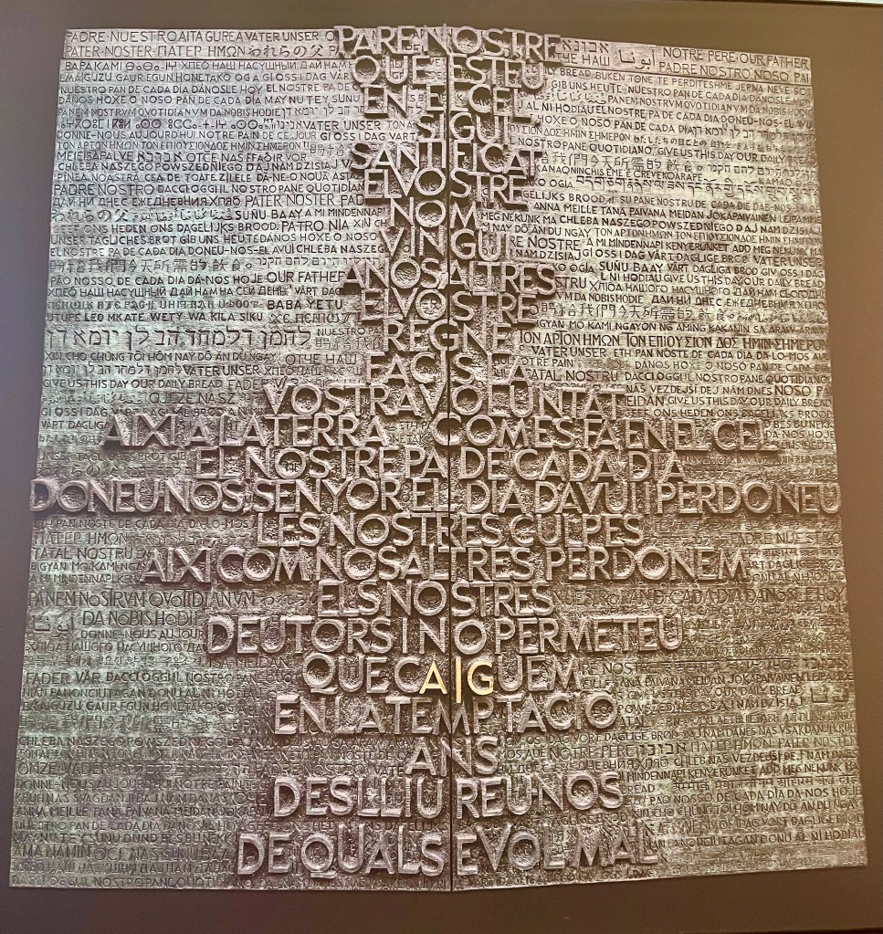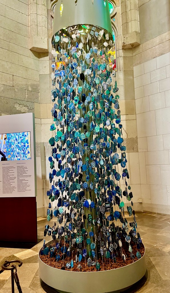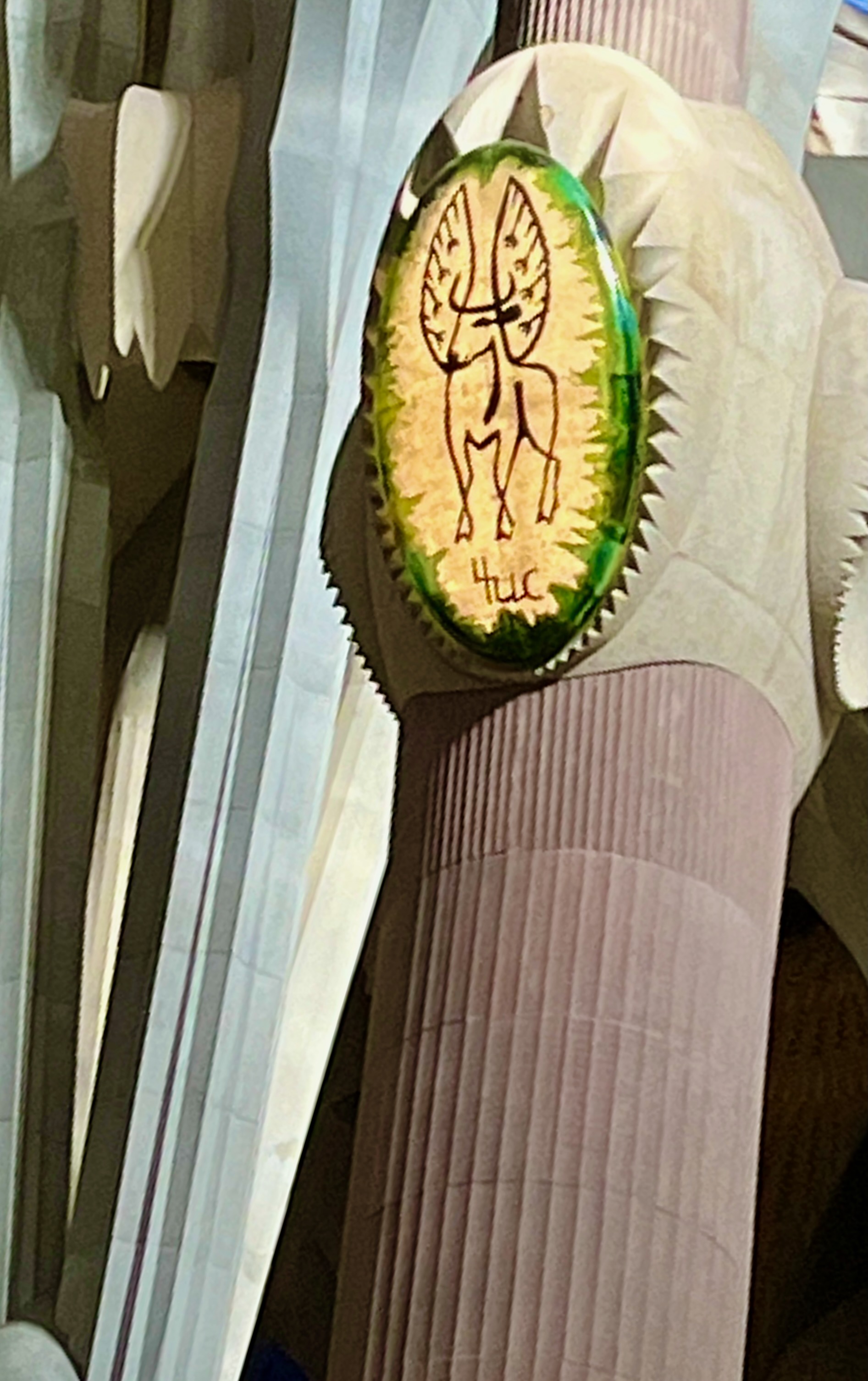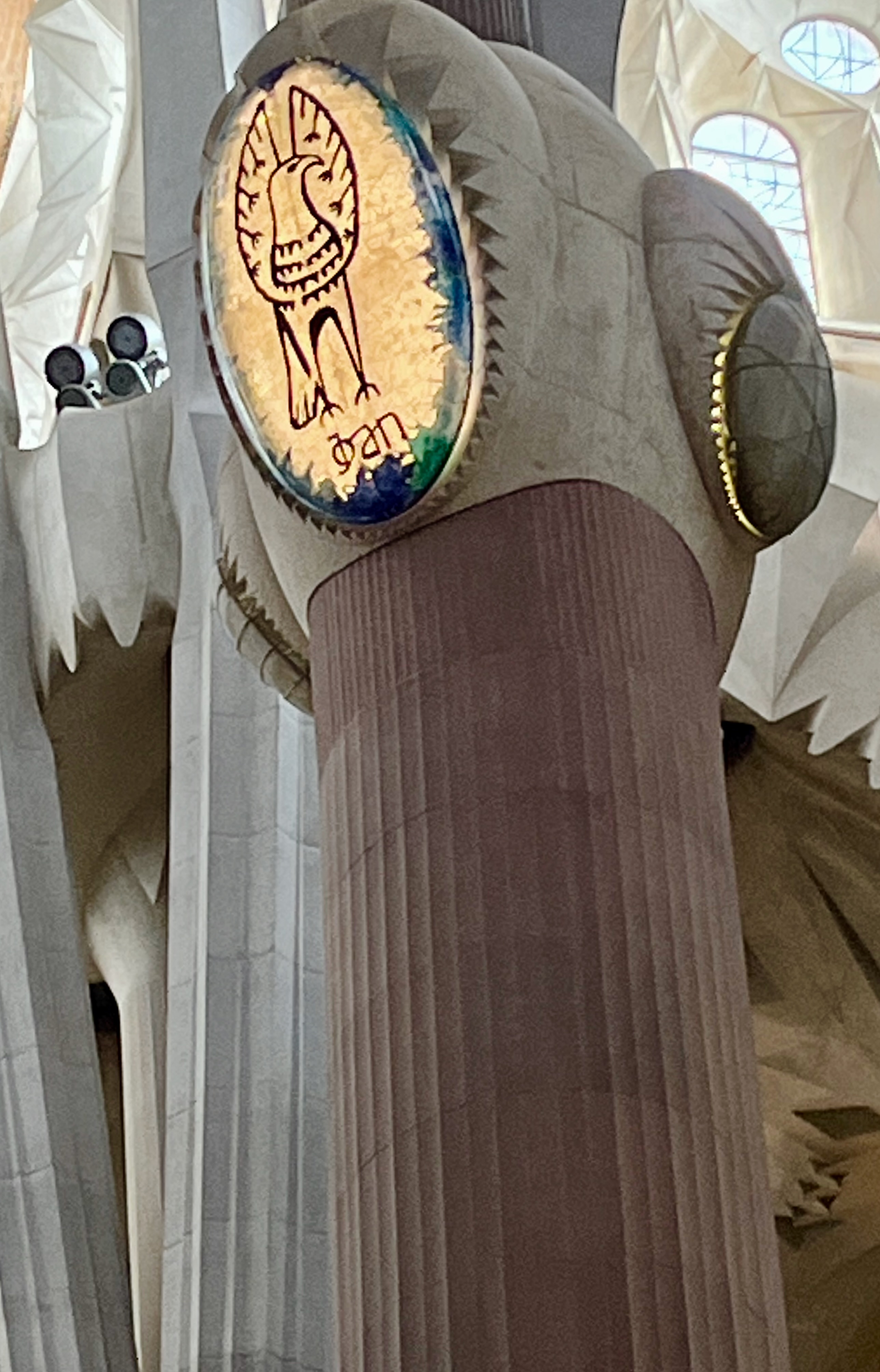 Gaudi’s vision included his love of nature. The columns (56 in all) are like trunks of trees with branches, leaves and knot-like capitals. Light filters through the stained glass windows with splashes of reds, browns, blues and greens. The four main columns, are each marked with an Evangelist’s symbol and name in Catalan.