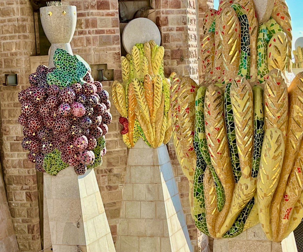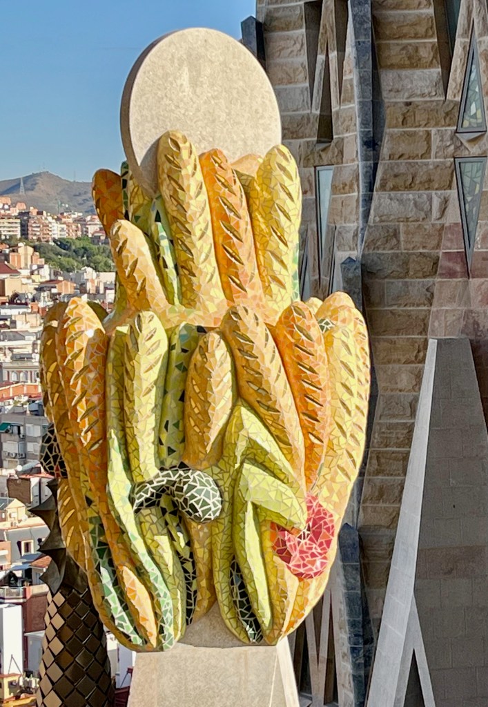 You enter on the Nativity Facade is only a side entrance to the church. There are three facades, Nativity, Passion and Glory chronicle Christ’s life from birth to death and resurrection. Only the Nativity and Passion are complete. Gaudi was a devote Catholic. The four spires of the Nativity Facade are dedicated to apostles and they repeatedly bear the our “santus” or holy. Their colorful ceramic caps symbolize the miters (formal hats) of bishops. The shorter spires symbolize the Eucharist alternating between chalice with grapes and communion host with wheat.