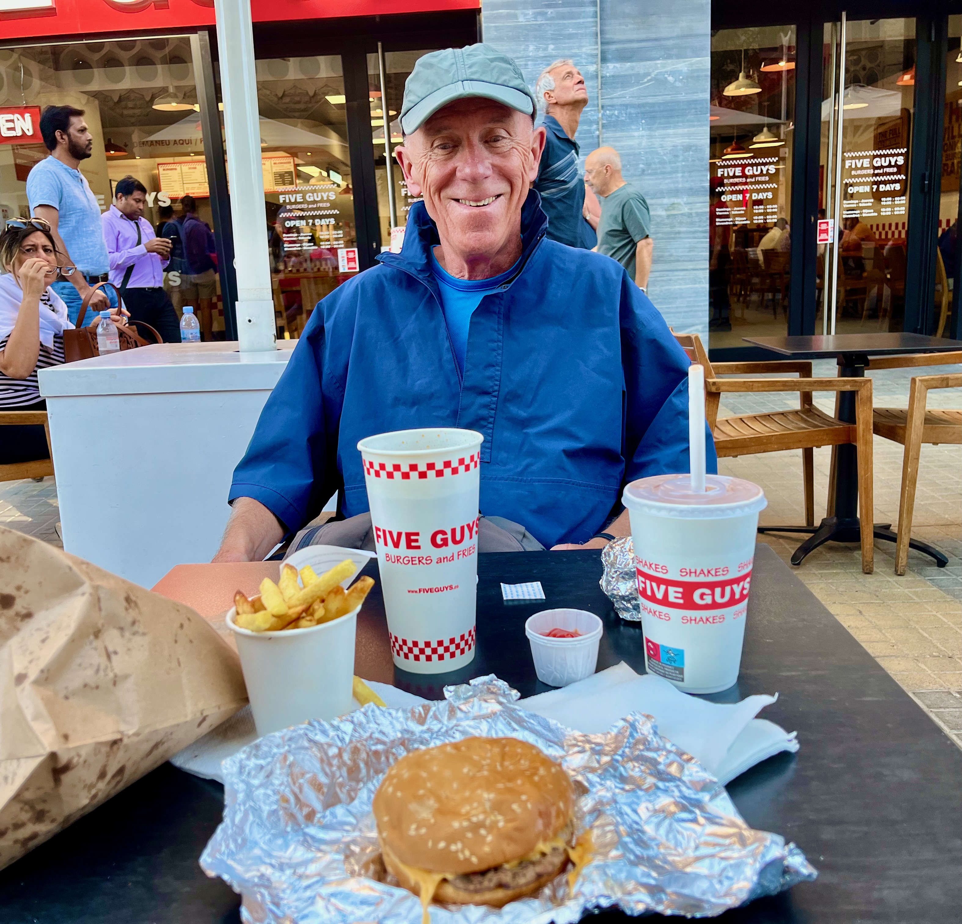 I had only had a Five Guys burger once and here I am in Barcelona Spain having another. I ate my cheese burger and chocolate malt. It tasted surprisingly good. After I ate, we walked to get a coffee and when walking to the park to sit and I began to feel ill. Stomach upset (what could have caused this??).