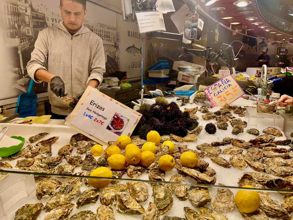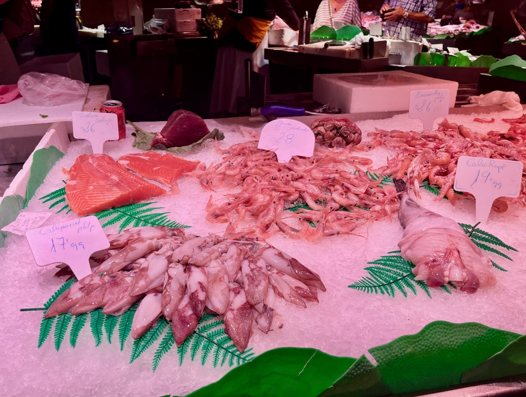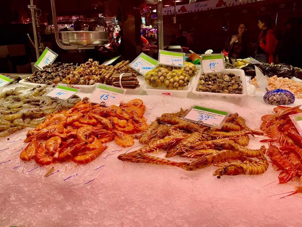 The fishmonger stalls abound with whole fish, different types of prawns, razor clams, oysters and calamari.