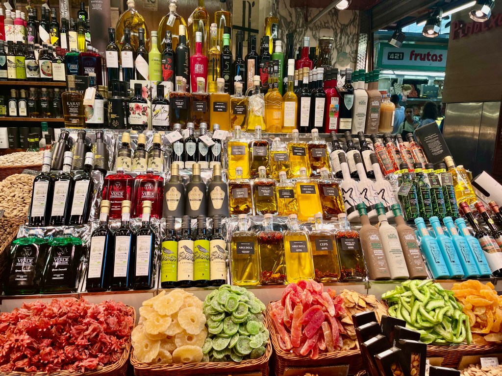Stands show off seasonal fruits and vegetables. The focus is on Spanish specialties like olives and saffron. There are tubs of little green peppers that look like Jalapeños that are lightly fried for a dish called pimientos de Padron. Eating these, like we did at Bodega La Puntual on Saturday, is a bit risky because although most are mild sometimes they are hot. Just ask Mary!