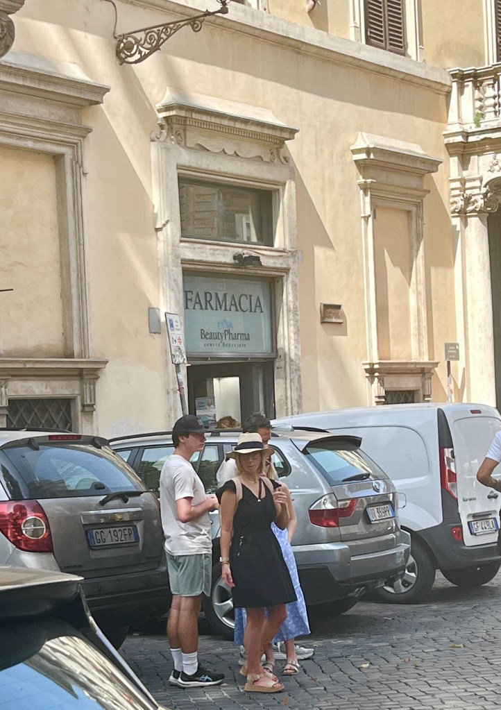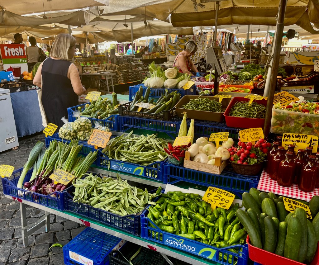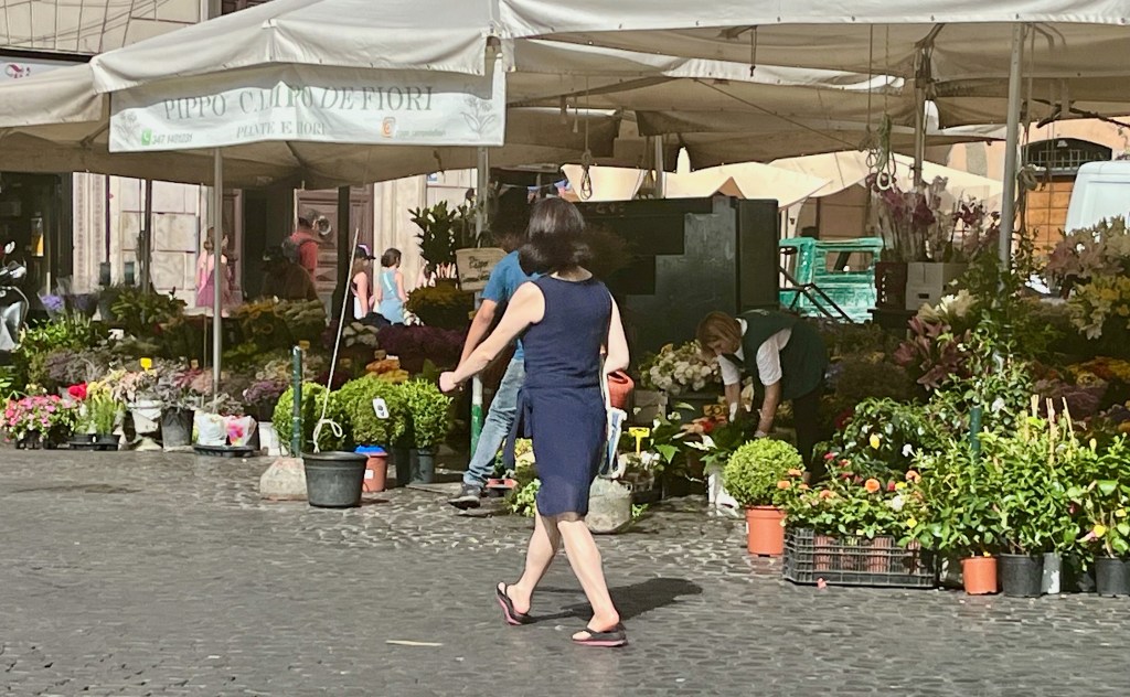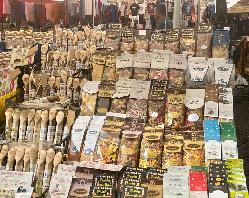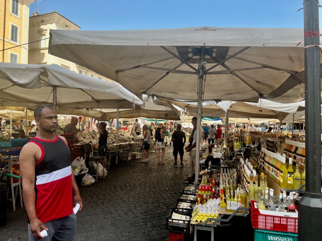 Campo de’ Fiori (field of flowers) is an open air market. In the Middle Ages it used to be a meadow of flowers, thus the name. The square is busy with vendors selling, flowers, fruit, vegetables, pasta, herbs, limoncello, olive oil, vinegar, clothing and various other items. Katelyn was looking for a pair of white pants and/or a dress and Beth was looking for a hat. Both were successful. I hung out with the boys.