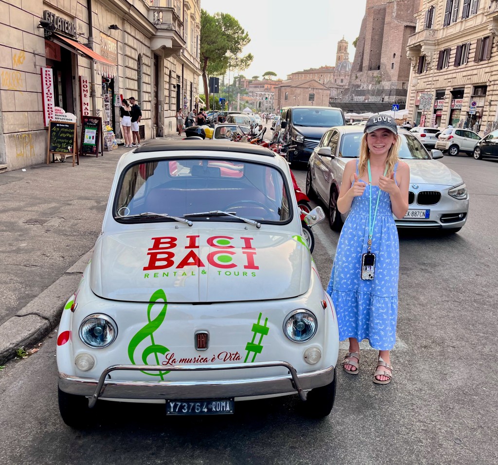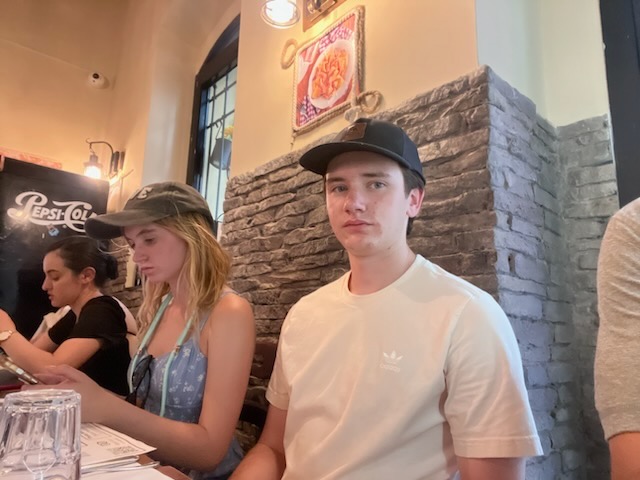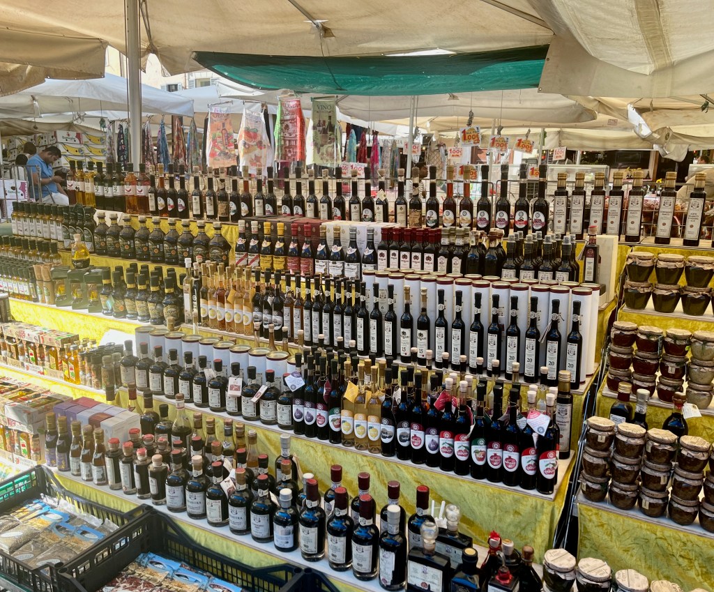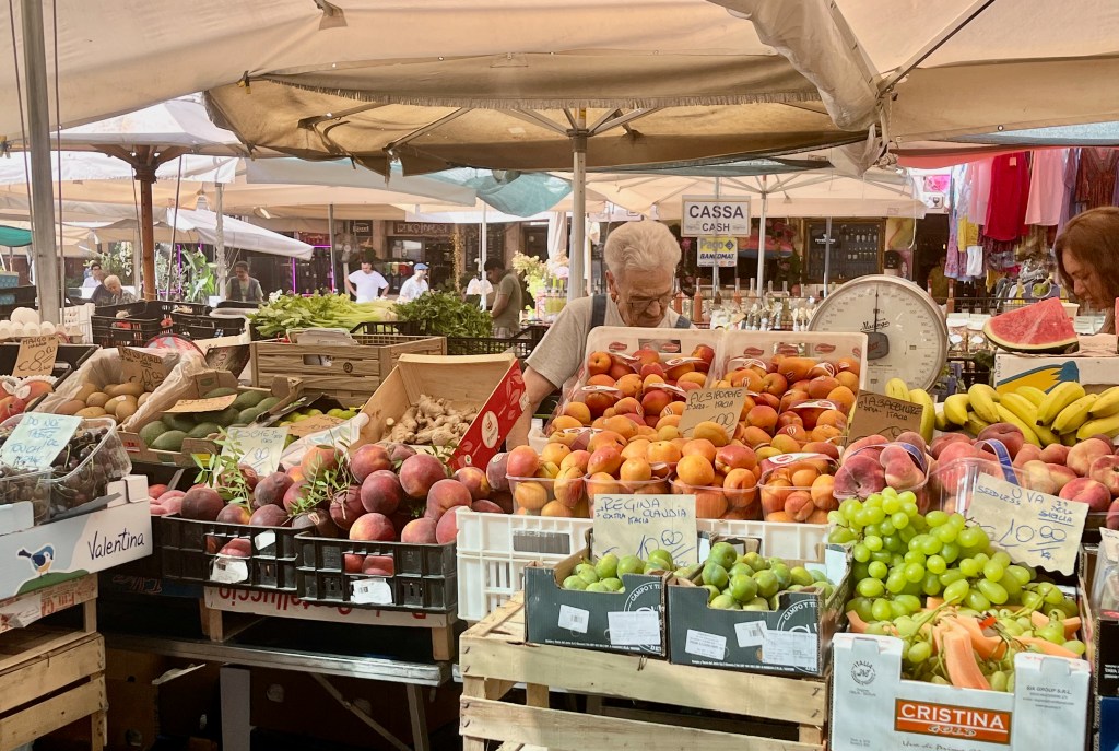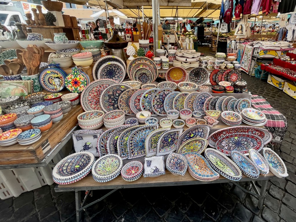 Campo de’ Fiori (field of flowers) is an open air market. In the Middle Ages it used to be a meadow of flowers, thus the name. The square is busy with vendors selling, flowers, fruit, vegetables, pasta, herbs, limoncello, olive oil, vinegar, clothing and various other items. Katelyn was looking for a pair of white pants and/or a dress and Beth was looking for a hat. Both were successful. I hung out with the boys.