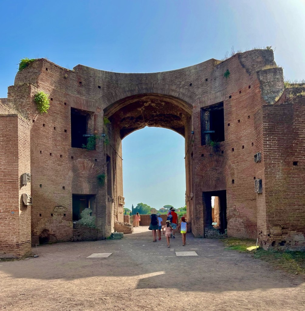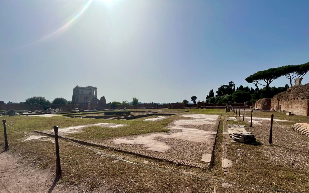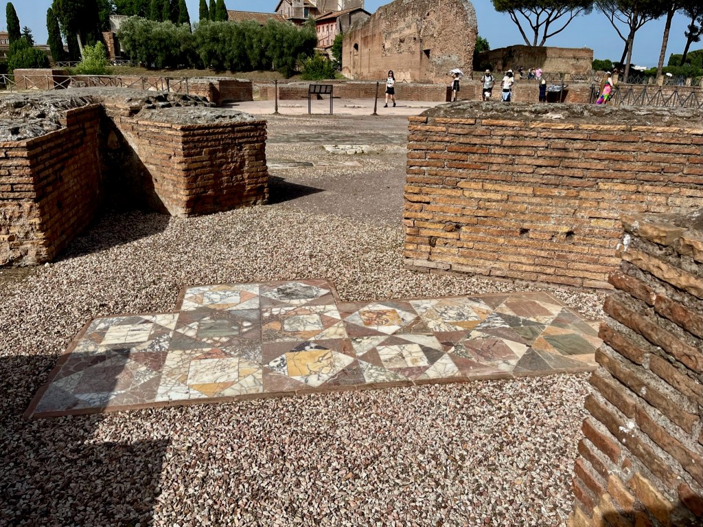 The Palatine Hill is the most famous of Rome’s seven hills. In ancient Rome it was considered one of the most desirable neighborhoods. The walls separate the different rooms in what would have been the homes. The mosaic floor below would have covered all the area in the home.