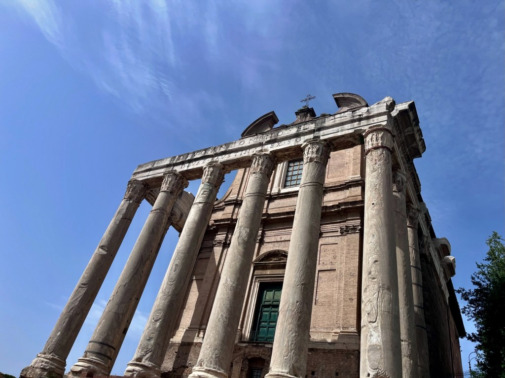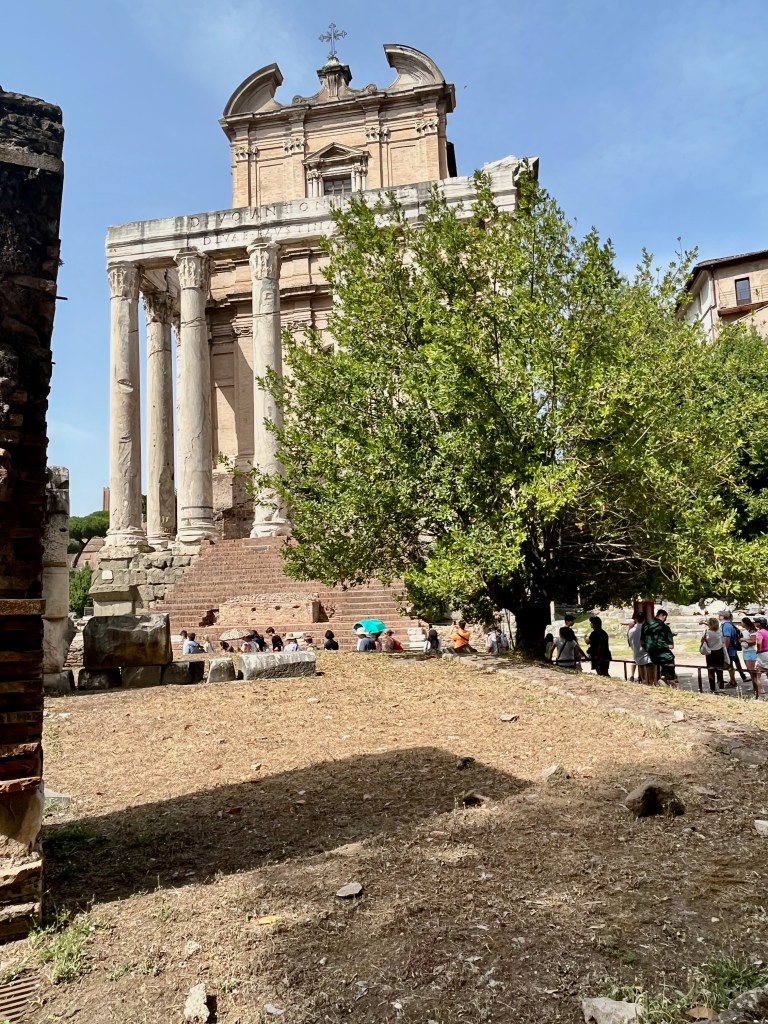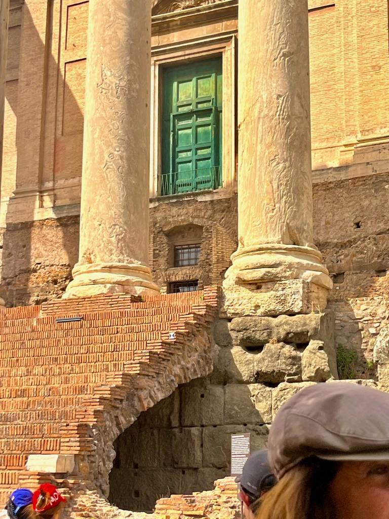 Above on the left is the Arch of Titus. Originally the menorah was painted a rich yellow. The arch inaugurated in AD 81 commemorates the Roman victory over Judea by Titus. It shows a triumphal ride on a chariot and the looting of the temple. On the right is the Temple of Antonius and Faustina. It was first dedicated in AD 141.