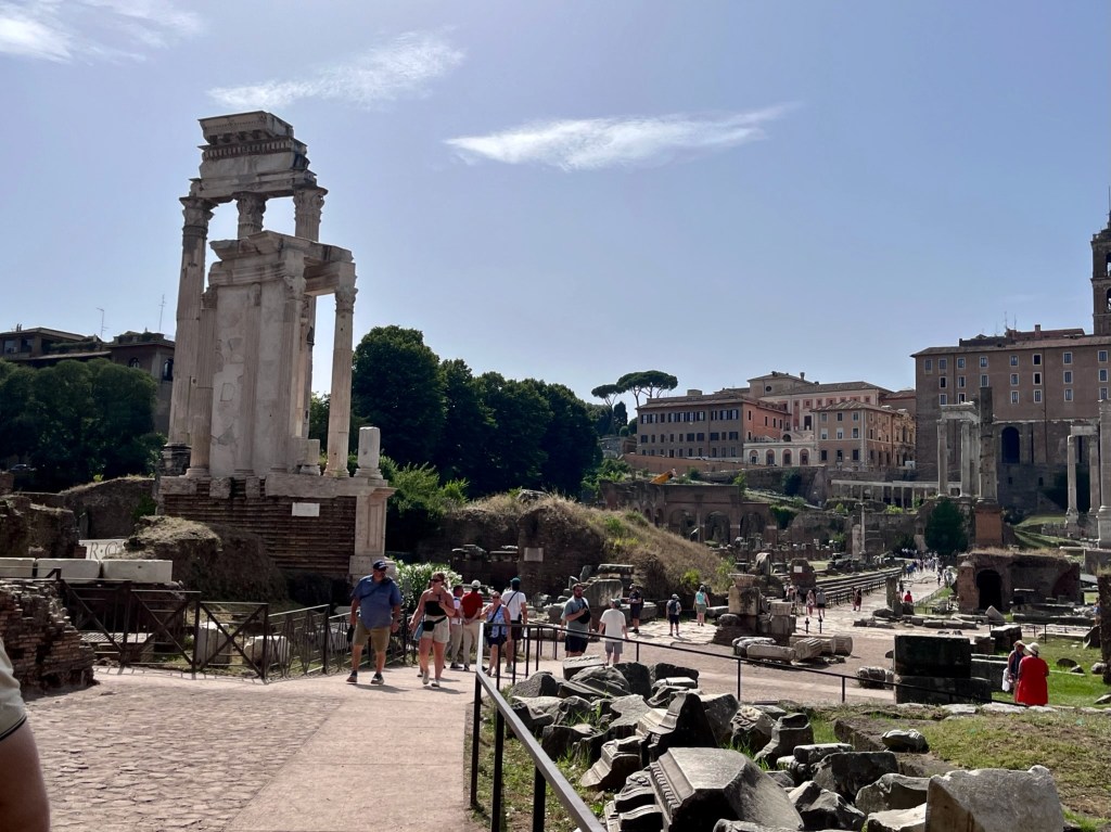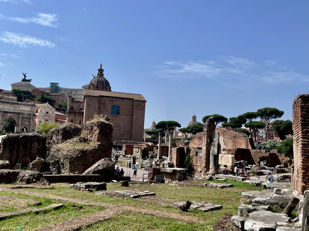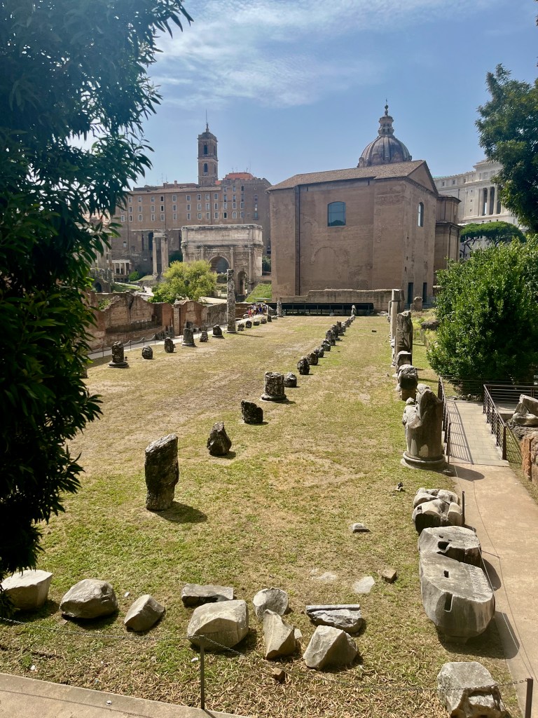 The Forum was the center of commercial and judicial life in Ancient Rome. The largest buildings were the basilicas where legal cases were heard. Lawyers, bankers, brokers, and shopkeepers all did their business and negotiations there. It was the teeming heart of ancient Roman life. As you enter the area you can see the remains of the meeting hall where business took place.