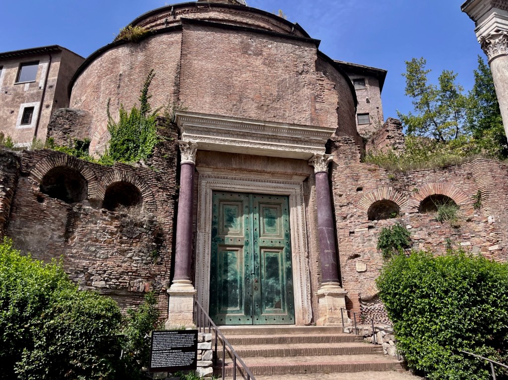 Temple of Divus Romulus built in the 4th century AD. It is largely intact due to being converted into the present day church Santi Cosma e Damiano. The large well-preserved bronze door is original.