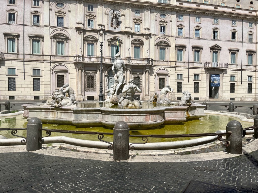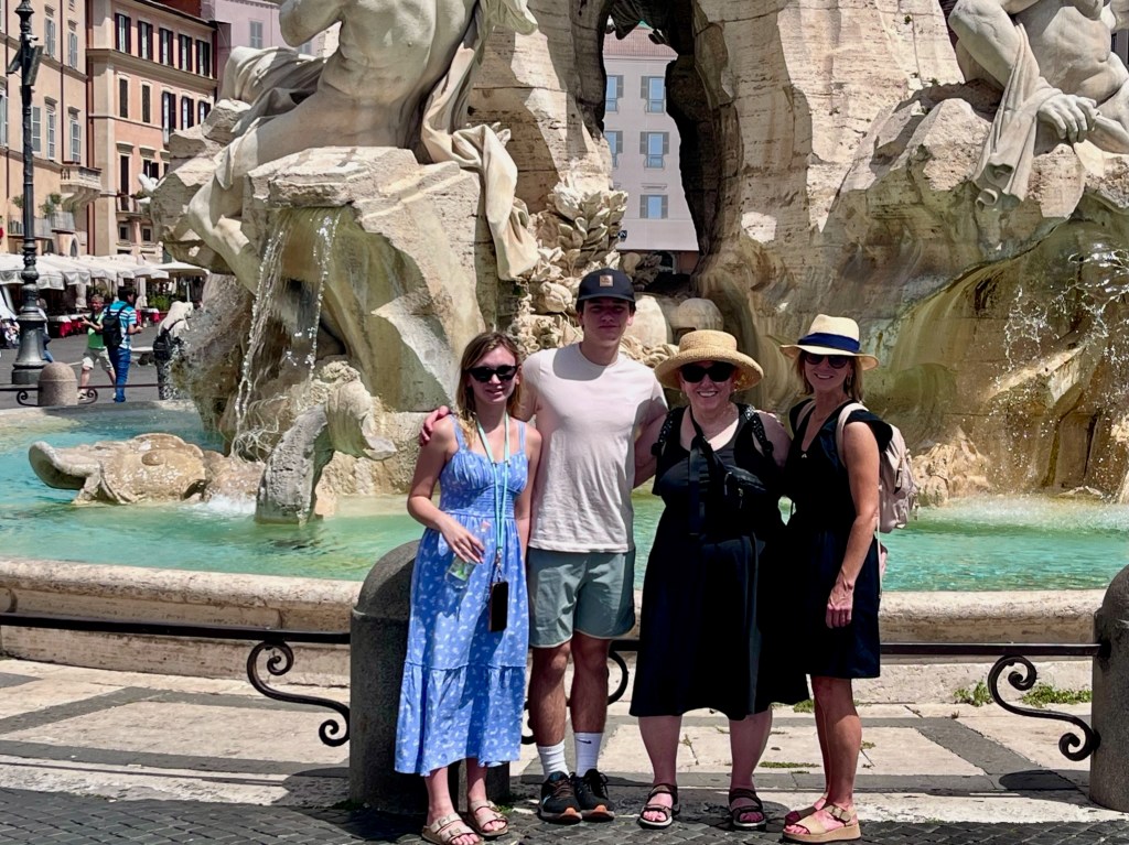 At the northern end is the Fountain of Neptune (1574) to balance with the Fontana del Moro ( I don’t have a picture of this). Below is the four of us just wishing we could jump in the fountain.