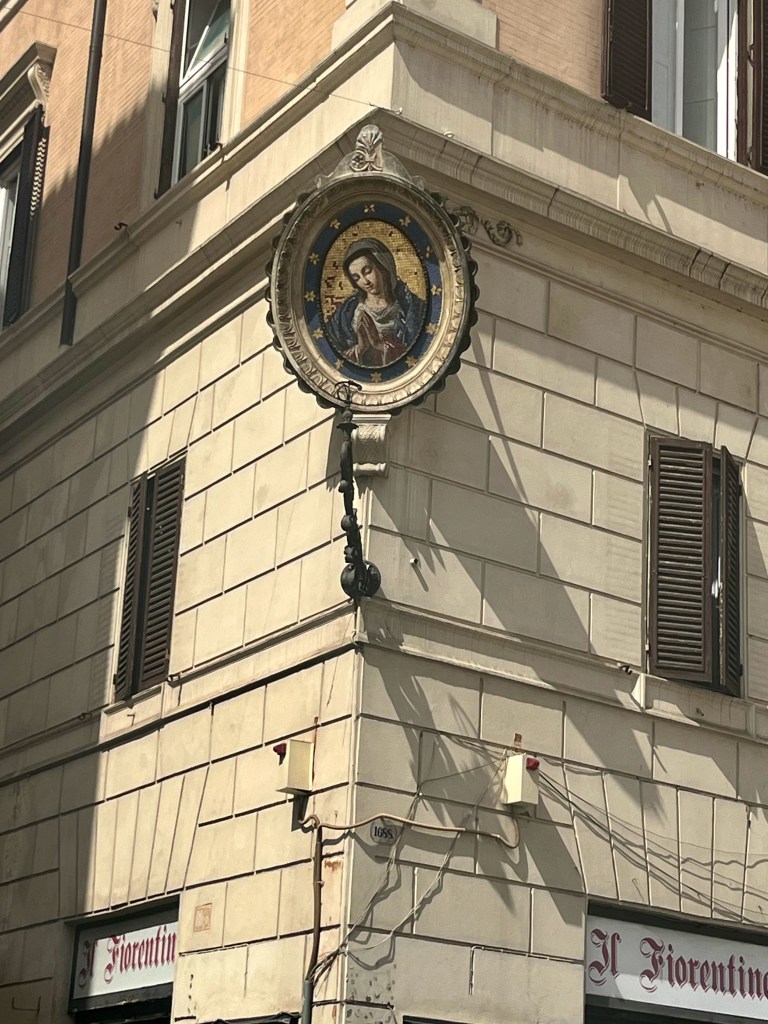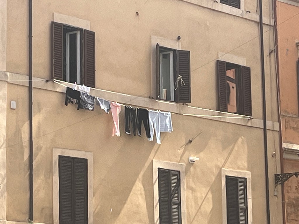 What we saw along the way. A religious picture on the corner of the building. We saw them frequently. Then, who needs a clothes dryer when you can just hang your clothes out the window? It was a “balmy” 88 degrees.