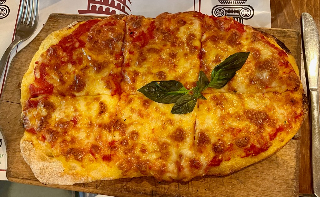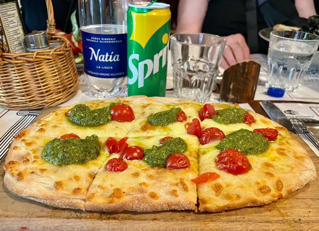 Jake’s pizza with pesto (not flavorful) and Kate’s Margarita pizza (over cooked).