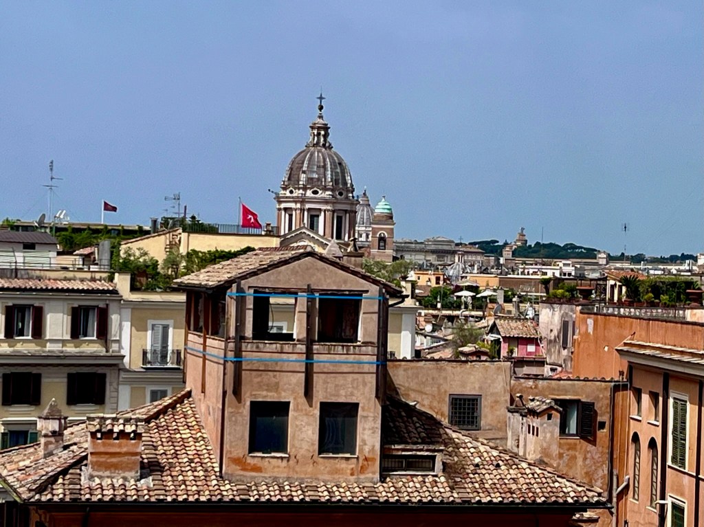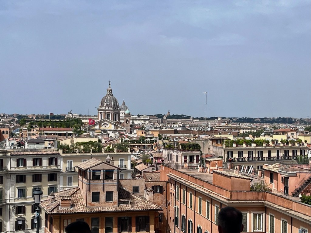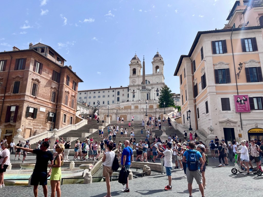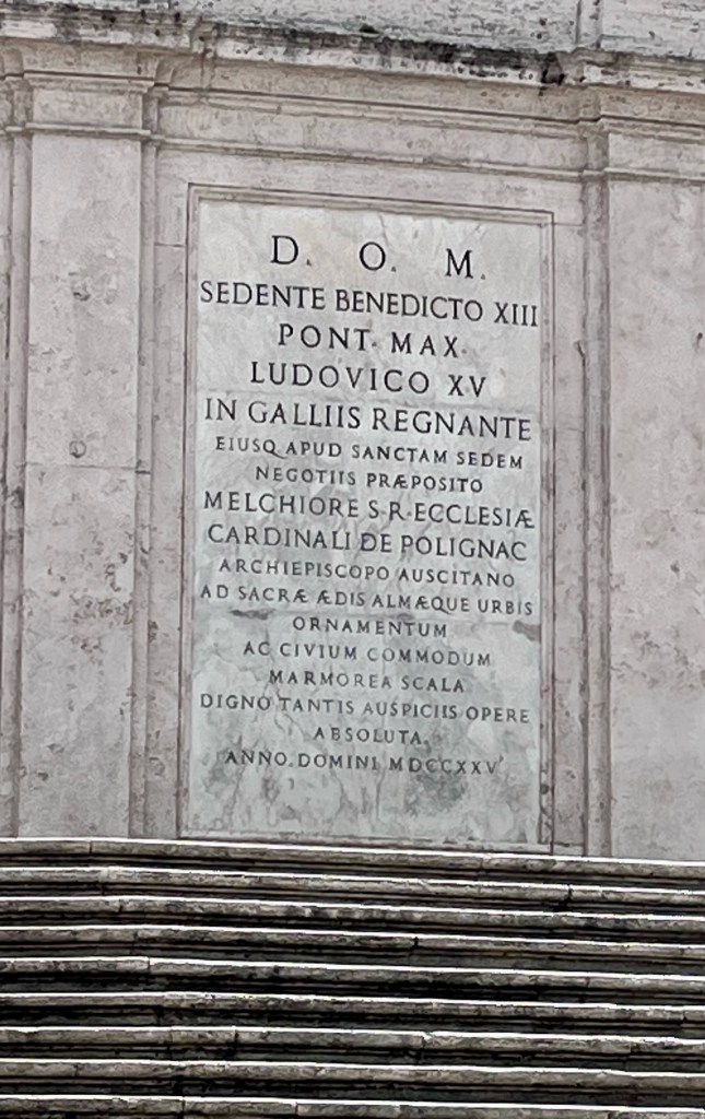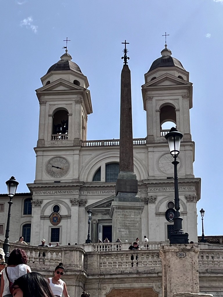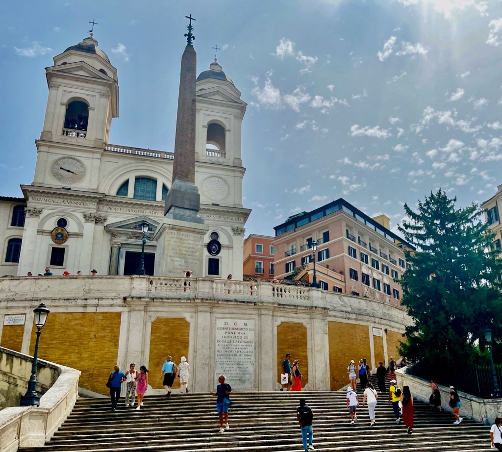 The church at the top of the stairs is the Trinita die Monti. It is unusual for Rome as it was founded by the French in 1495.