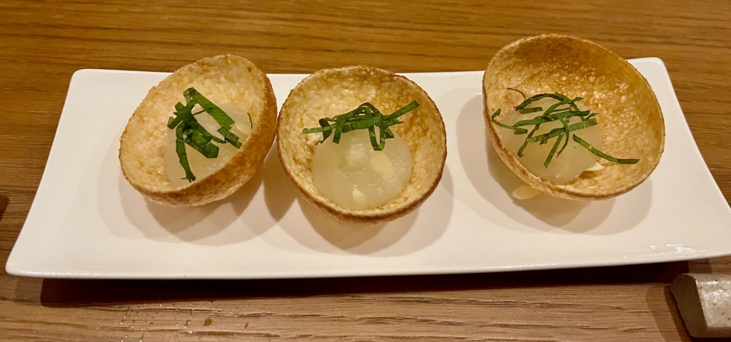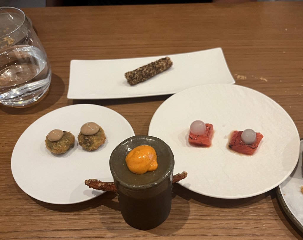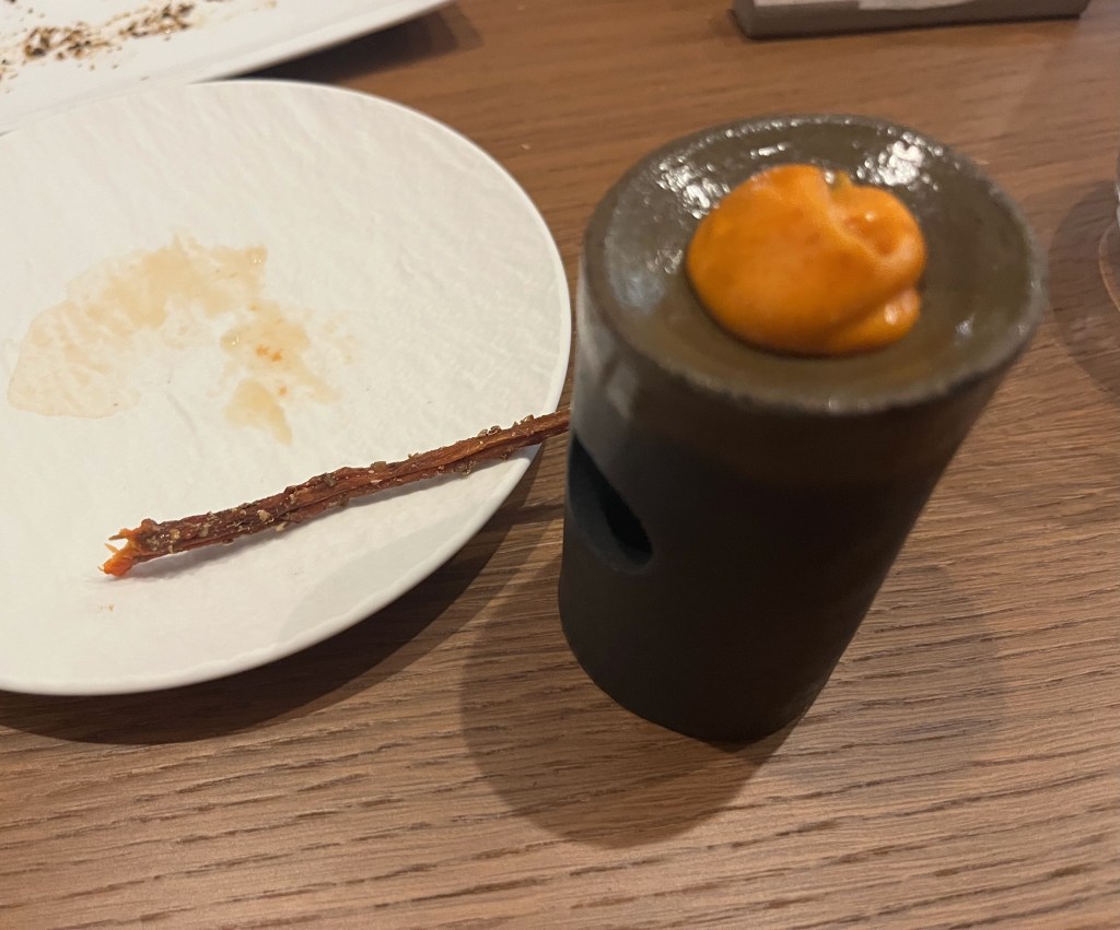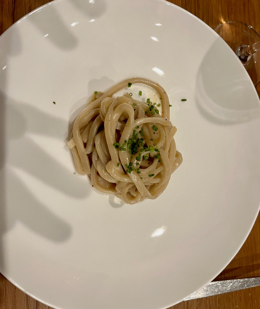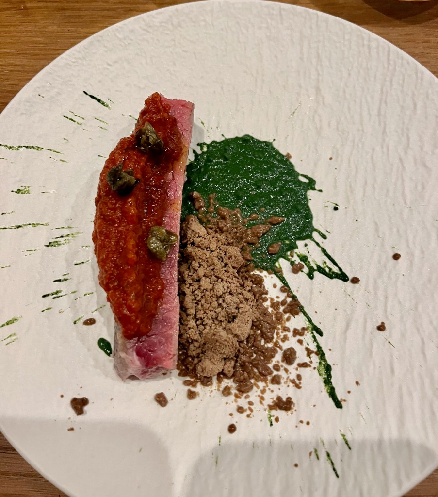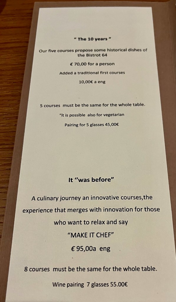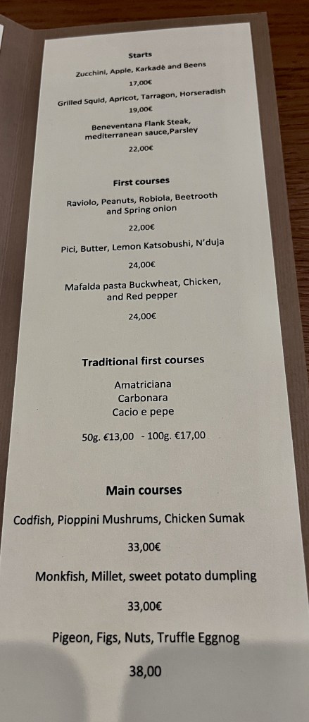 Bistrot 64 is located outside the Roman wall in a neighborhood which I imagine people who worked in the city live. We learned that the restaurant had a major remodel and further more, Michelin Stared chef Kotaro Noda was no longer there. Rather disappointing. The wait staff we met did not even seem to know about Stanley Tucci! Anyway, because we were 5 people we all had to order the 5 course menu. (All I really wanted was a huge plate of Cacio e pepe!). The cuisine is Italian and Japanese.