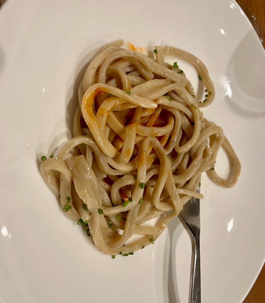 The fourth plate was Mafalda pasta Buckwheat, Chicken, and Red pepper. The red pepper was underneath and you had to combine it as in the second picture.