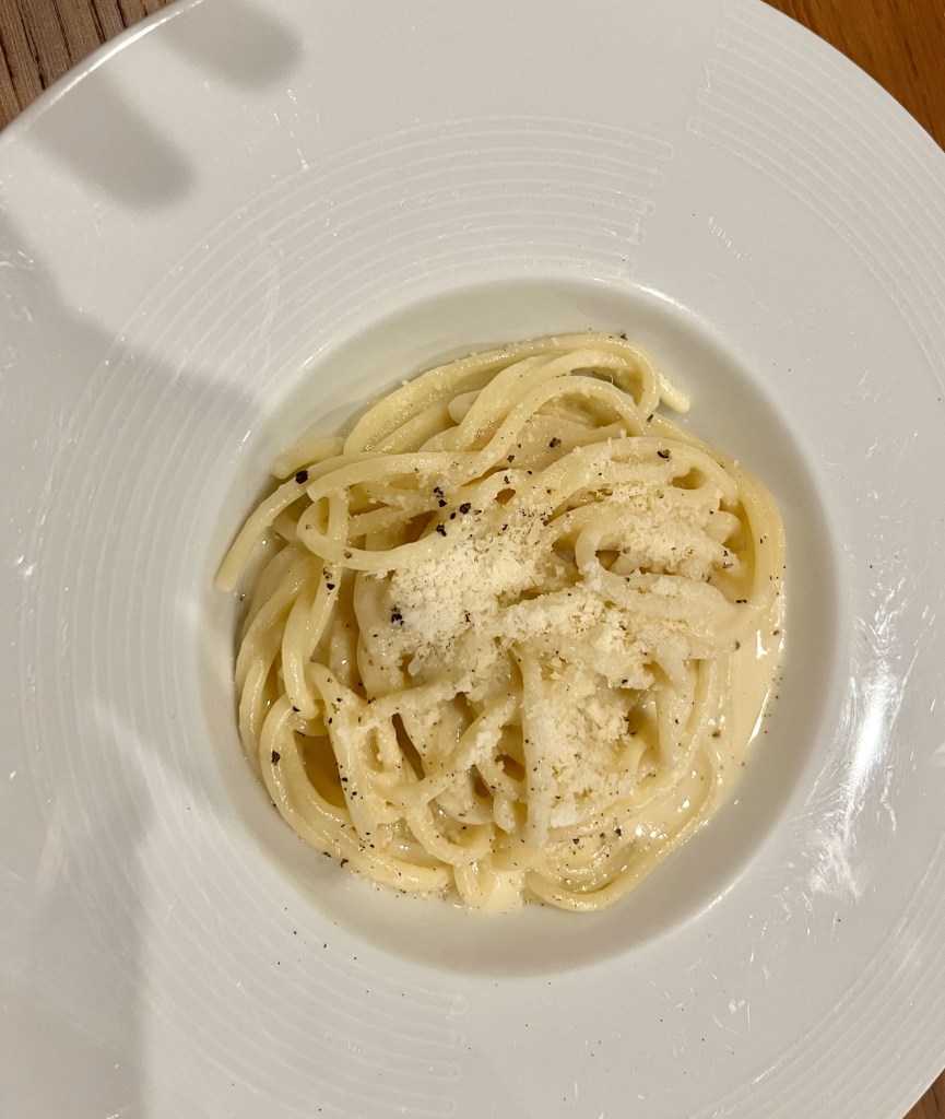 I watched Stanley Tucci’s finding Italy. In the Rome segment he visited Bistrot 64 and had what he described as the best Cacio e pepe he had ever had. I watched this several times writing down the recipe until I thought I finally had it down. It was good but tricky to make trying to get the cheese not to clump was a challenge. So, when I found out I was going to be going to Rome I started trying to make a reservation on the website and then calling. I discovered the restaurant was closed for remodeling but I finally got a reservation and we were going!!!! This restaurant had received a Michelin Star.