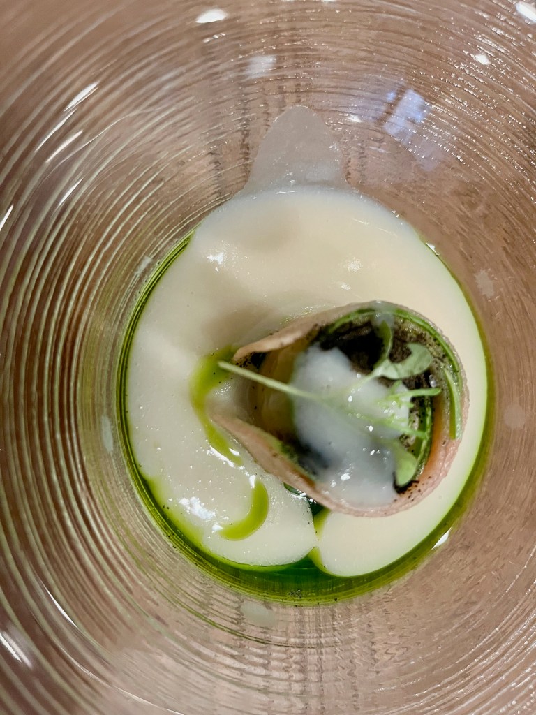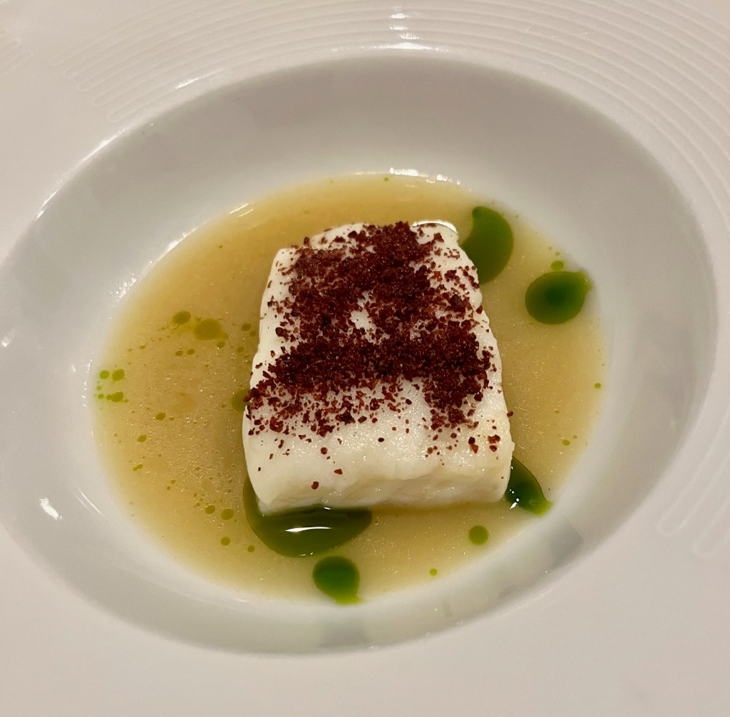 The main course was Codfish, Pioppini Mushrooms (long, thin stems and flat silky caps), Chicken Sumak broth.
