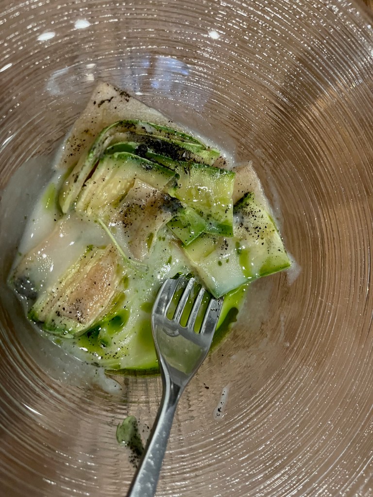 Starter: Zucchini, Apple, Karkade (tea) and beens. The zucchini and apple were wrapped around the beens and surrounded by the Karkade foam.