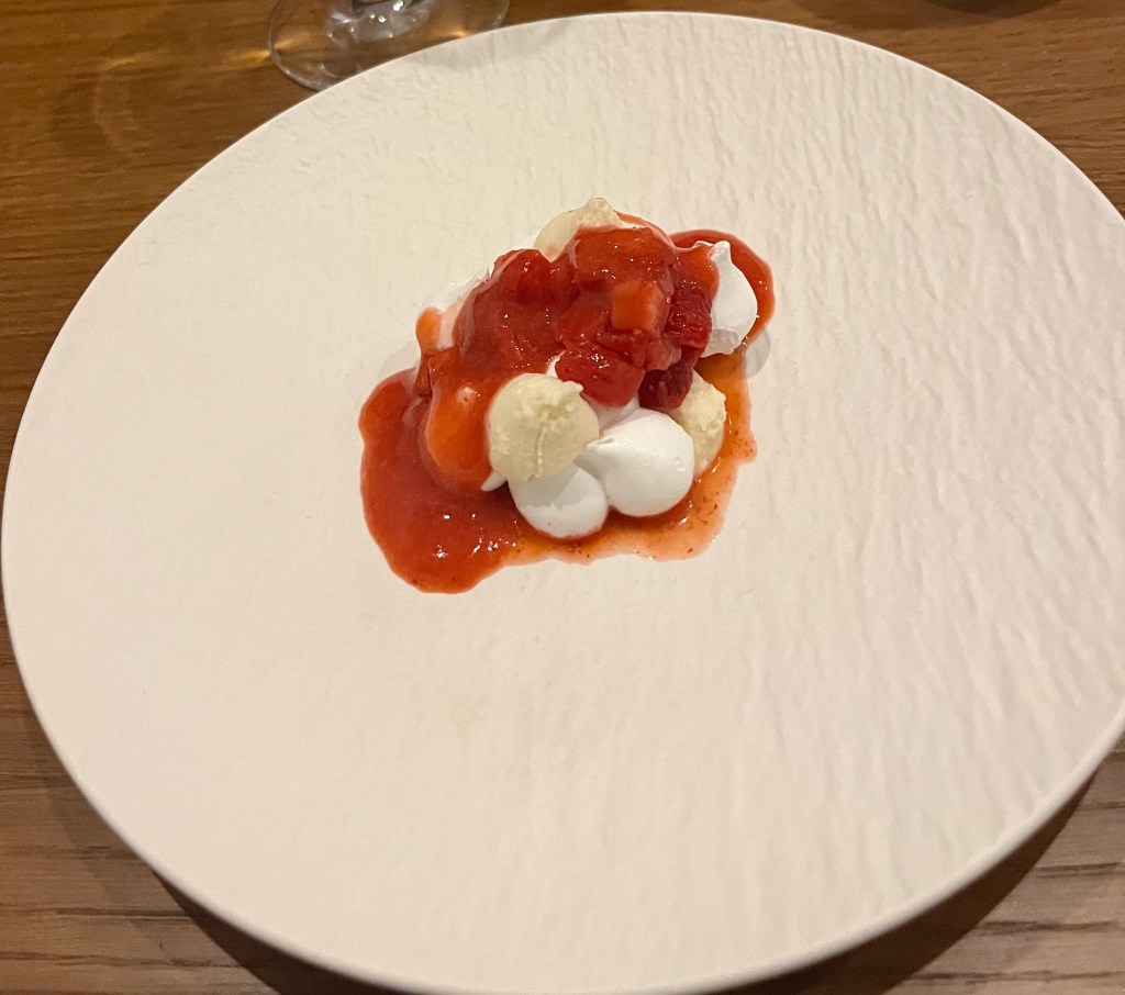 Two desserts. The first was strawberries with puffs of meringue and whipped cream. Delicate and delicious. The second was a final palate cleanser of lemon like sorbet with basil.