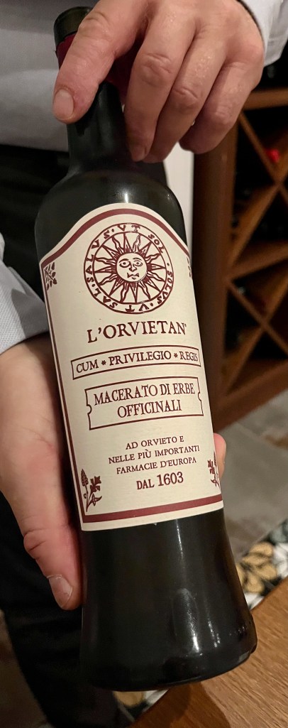Final wines were a semi sparkling Muscat Bland and the last was a digestive. The L’Orvietan is an ancient (1603)blend of 25 types of medicinal herbs described as a “potion”. It was used for medicinal purposes but also to “cure” love sickness! It was dry with a very bitter aftertaste and it was not our favorite.
