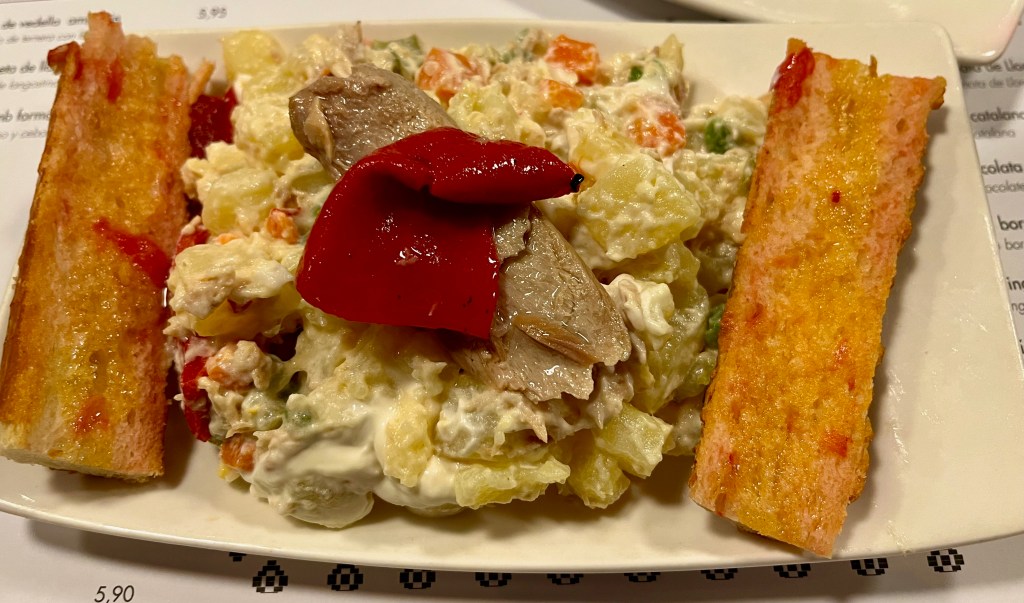 Today the recipe of this typical tapa has become very minimalist and it mainly consist of; carrots, potatoes, peas, tuna, mayonnaise, olives and capers.